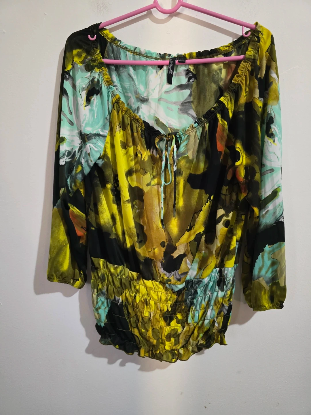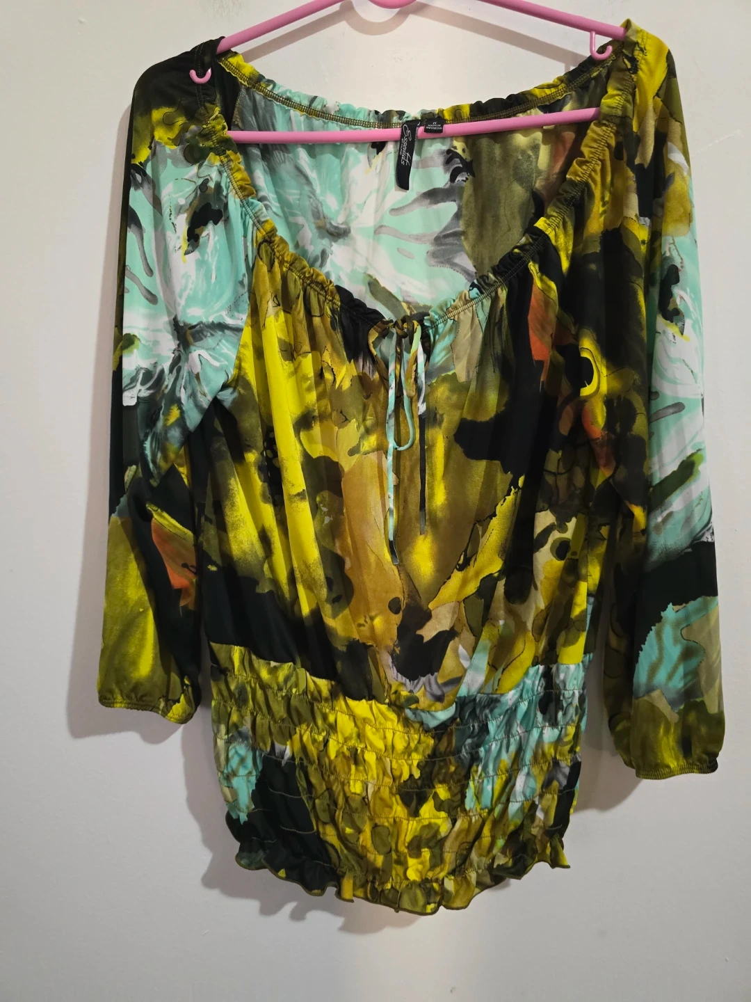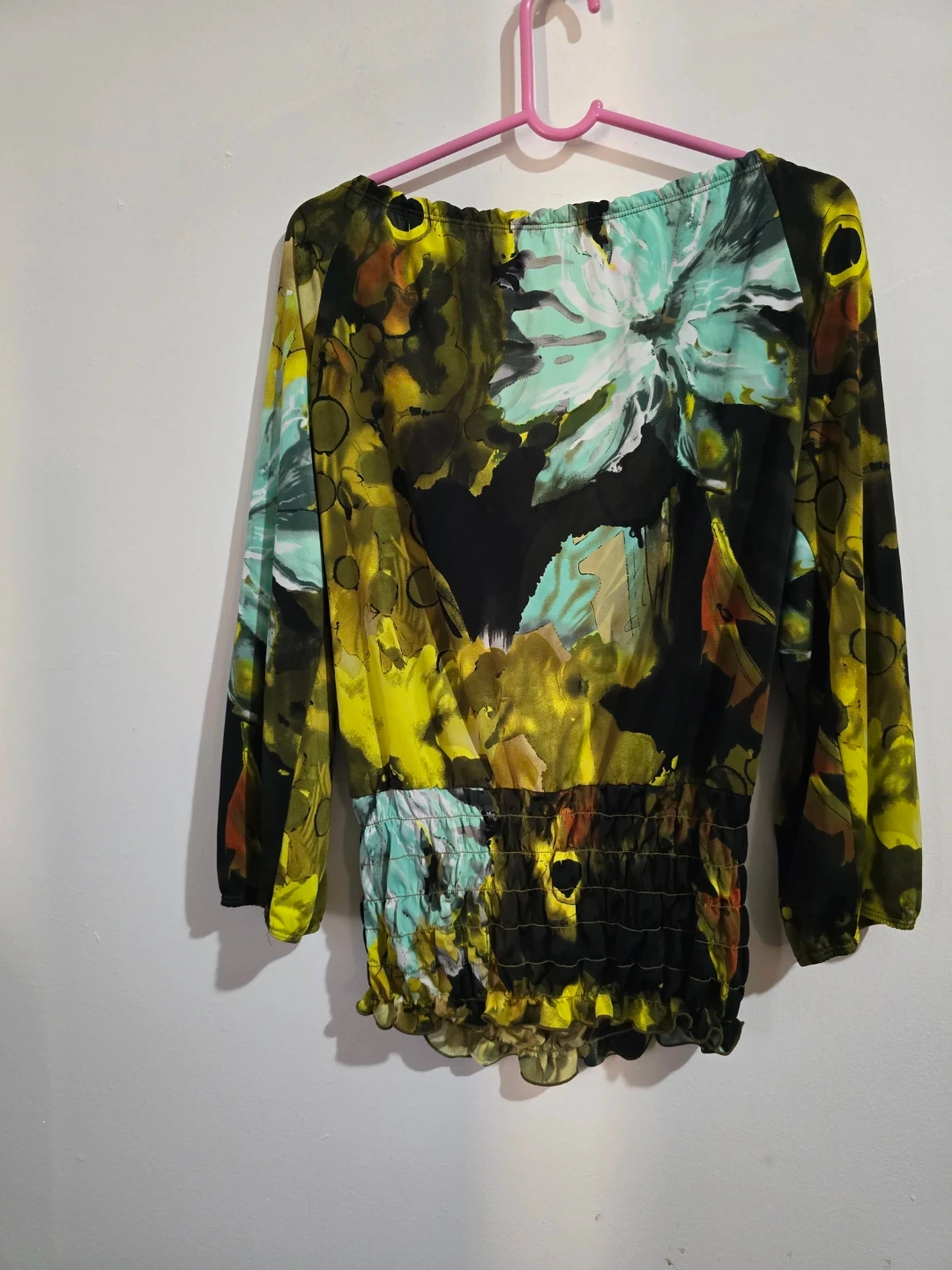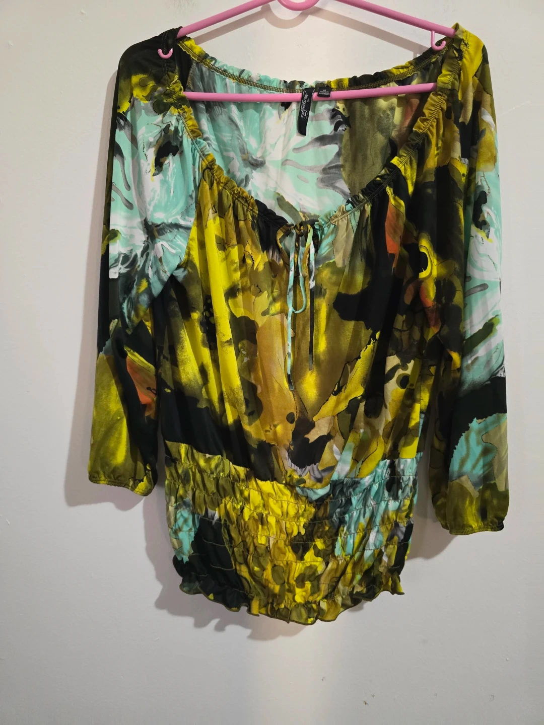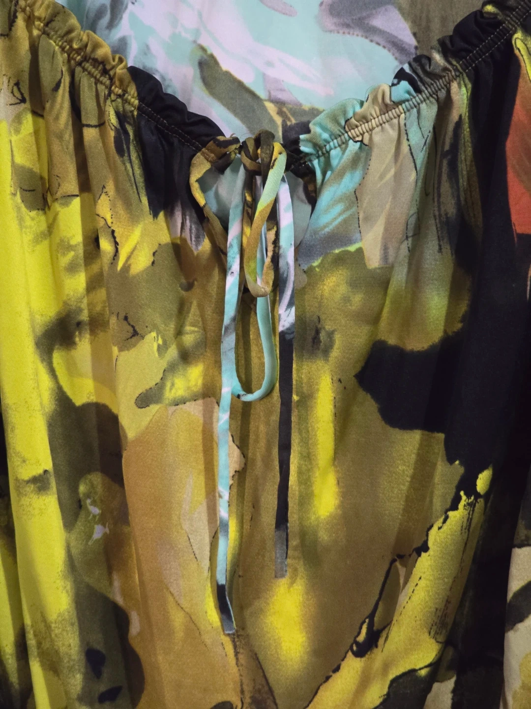 This long-sleeved blouse features a vibrant abstract print with a mix of yellow, black, and teal. It has a drawstring tie neckline and a smocked waist for a flattering fit. The material is lightweight and airy, making it comfortable for warmer weather.
