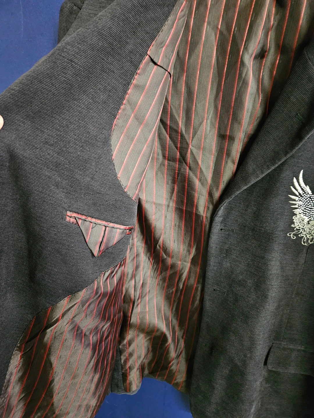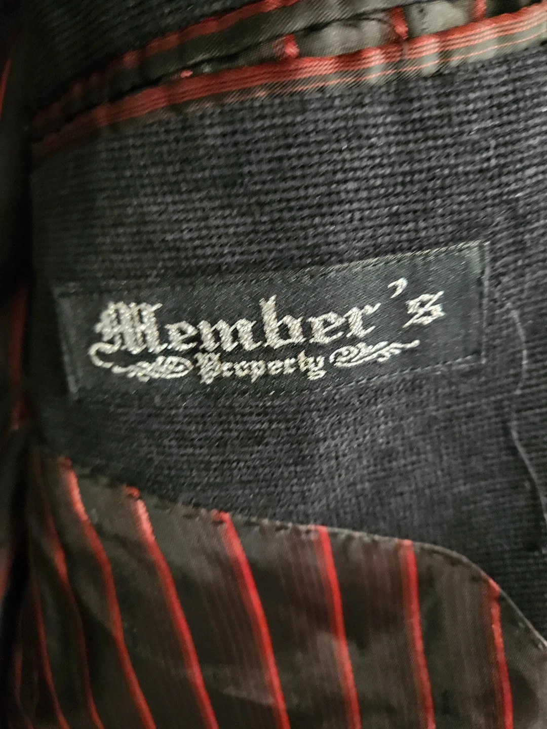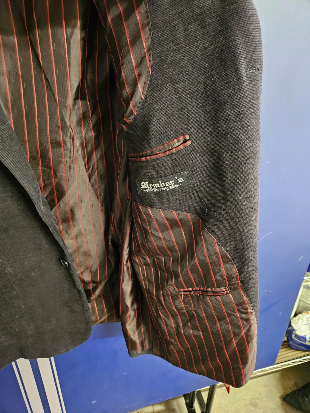 Member's Only blazer with a striped lining. Features an embroidered eagle on the left chest and on the back. Material is a corduroy-like fabric.
