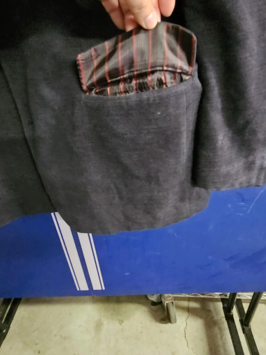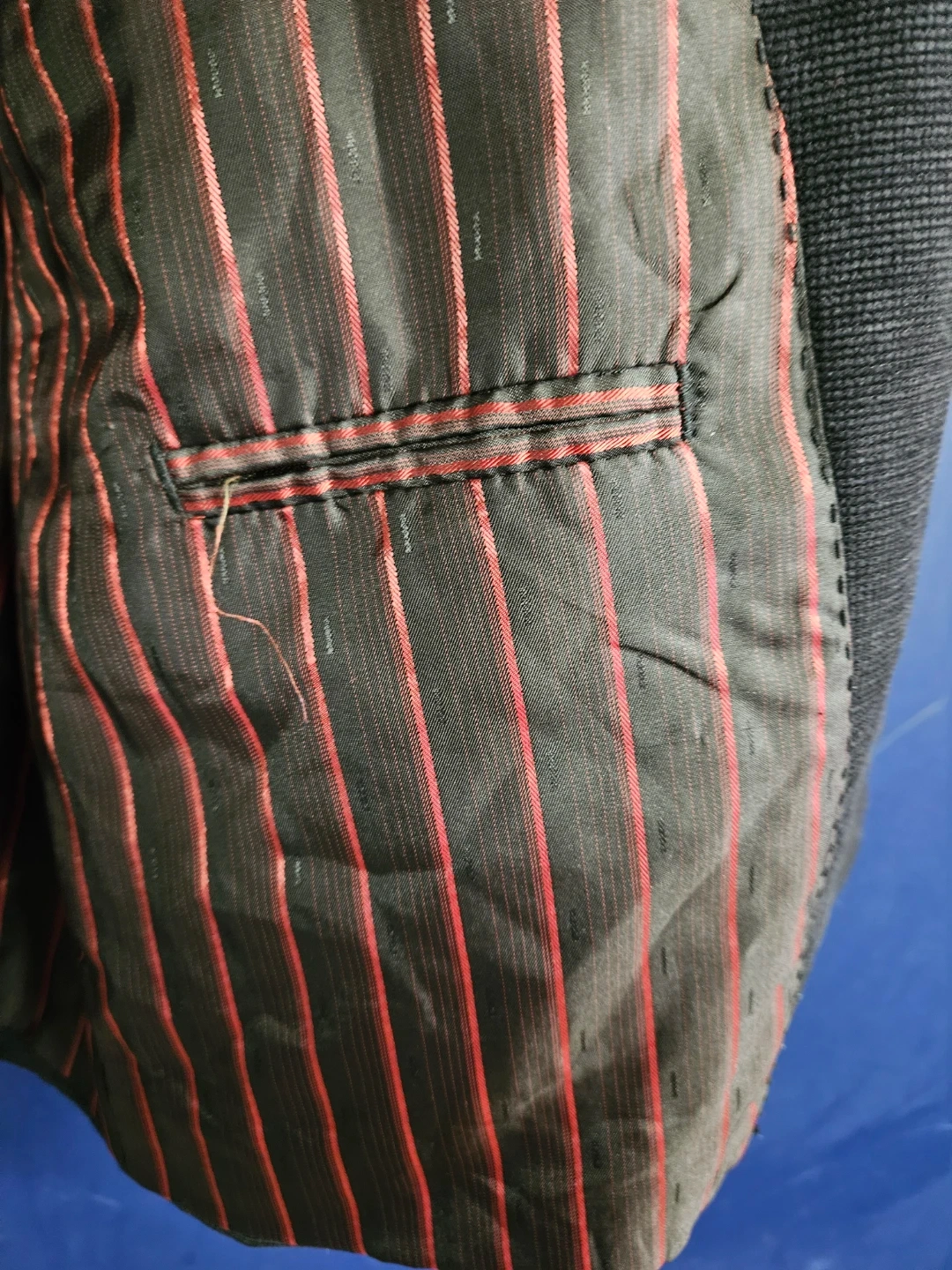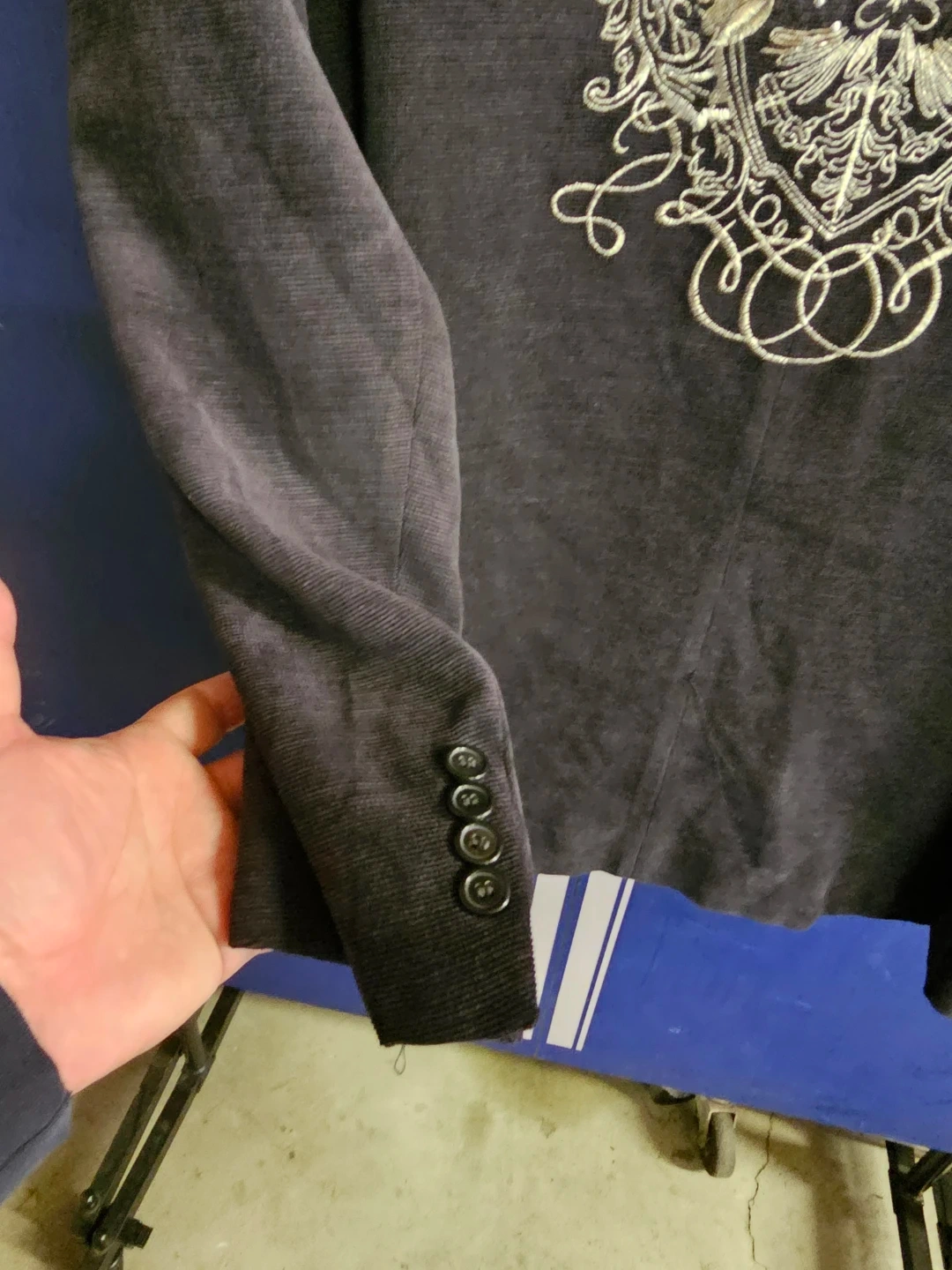 Member's Only blazer with a striped lining. Features an embroidered eagle on the left chest and on the back. Material is a corduroy-like fabric.