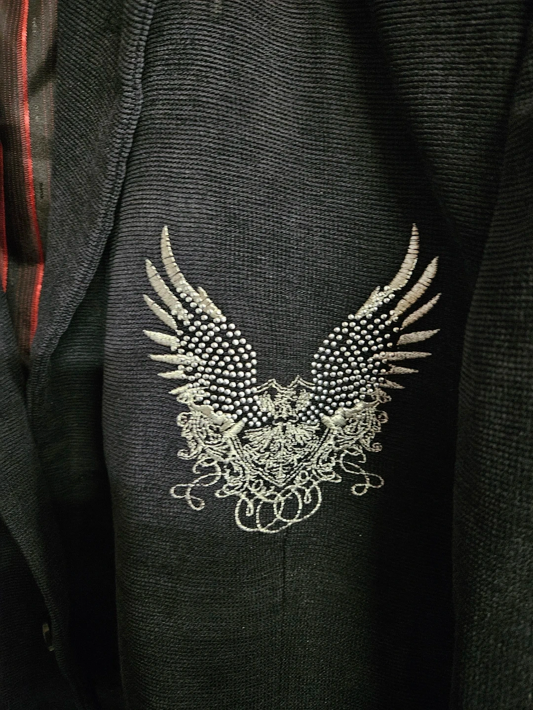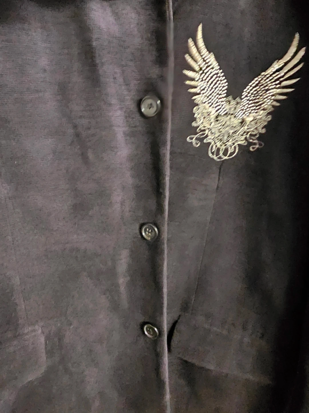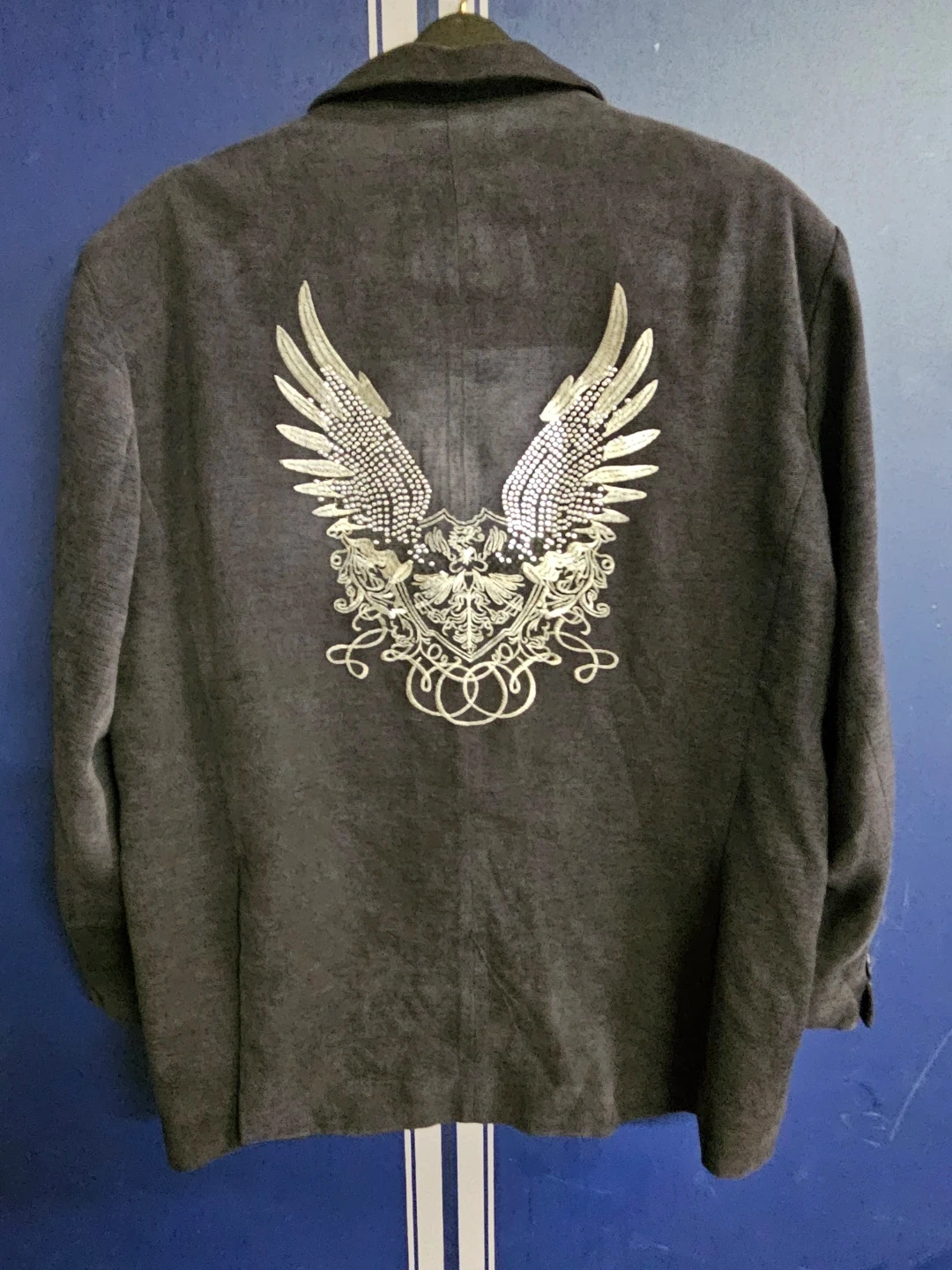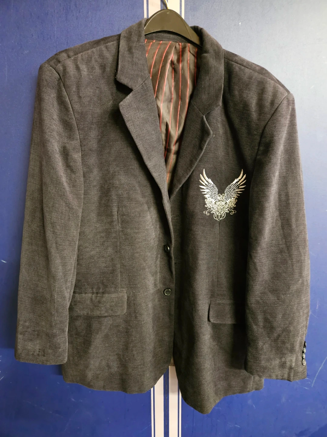 Member's Only blazer with a striped lining. Features an embroidered eagle on the left chest and on the back. Material is a corduroy-like fabric.