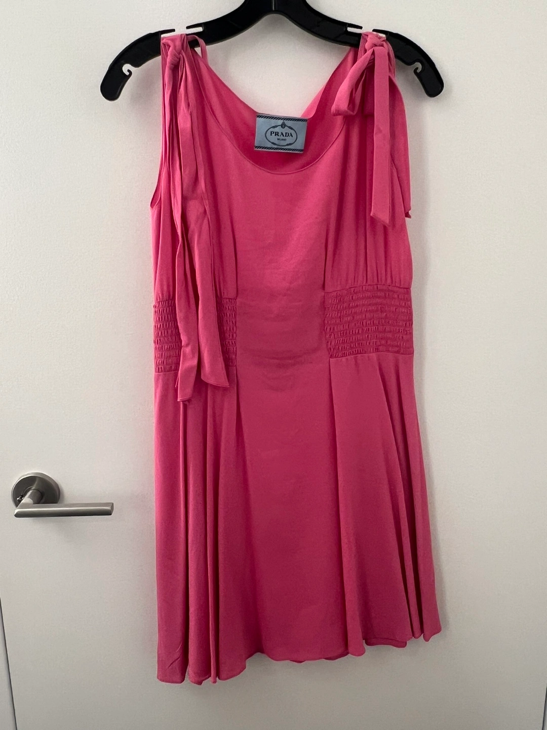 Adorable pink mini dress. Features a smocked waist, sleeveless design, and shoulder ties. Lightweight fabric. Perfect for summer.