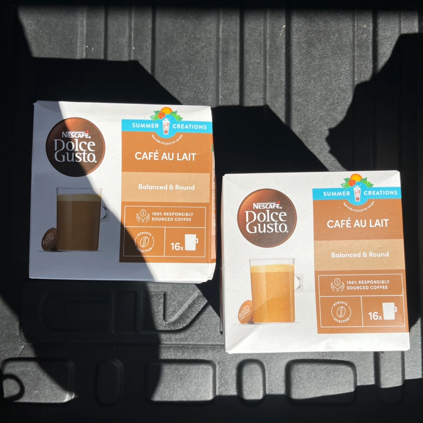 Two boxes of Nescafe Dolce Gusto Cafe Au Lait coffee pods. Summer Creations. Balanced and round flavor. 16 pods per box. 100% responsibly sourced coffee. Robusta selection.