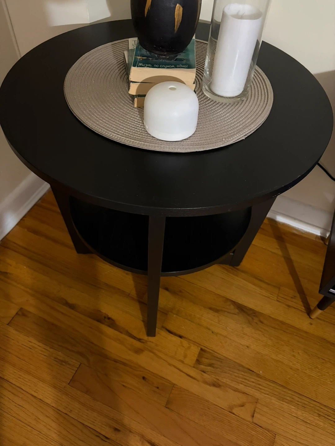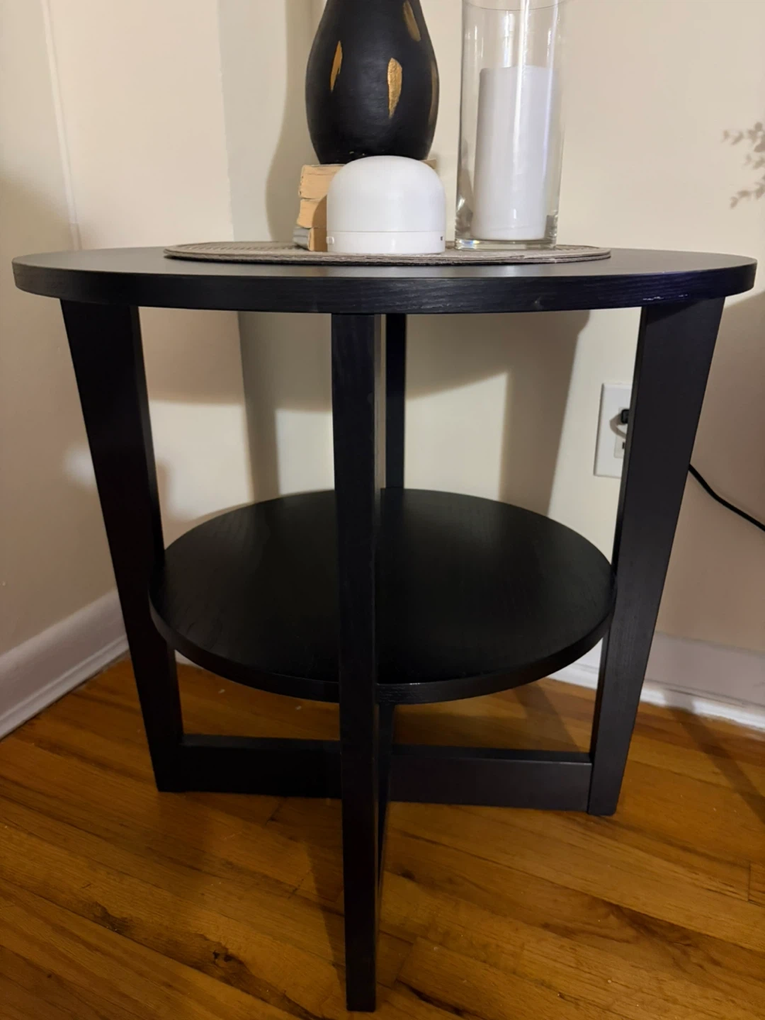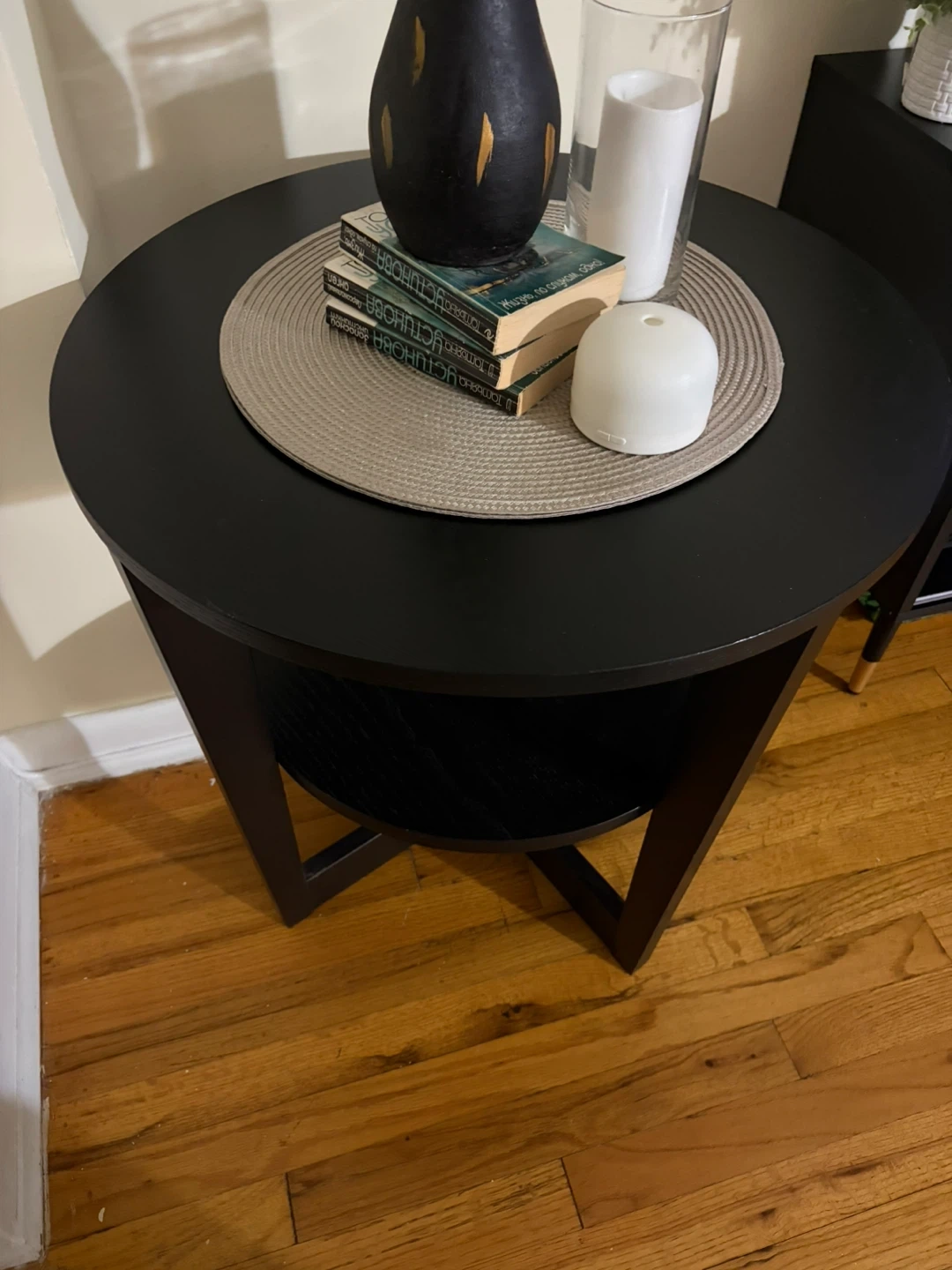 I'm selling a round table in black. It has a simple, modern design with a lower shelf for storage or display. It's in great condition and would be a nice addition to any living room or bedroom