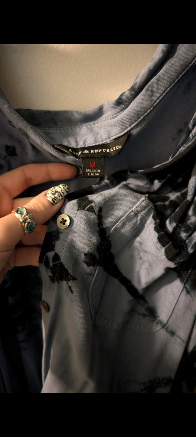 Blue sleeveless shirt. Button-down closure, small chest pocket, acid wash design, lightweight material. From home with dogs near Damen & Montrose