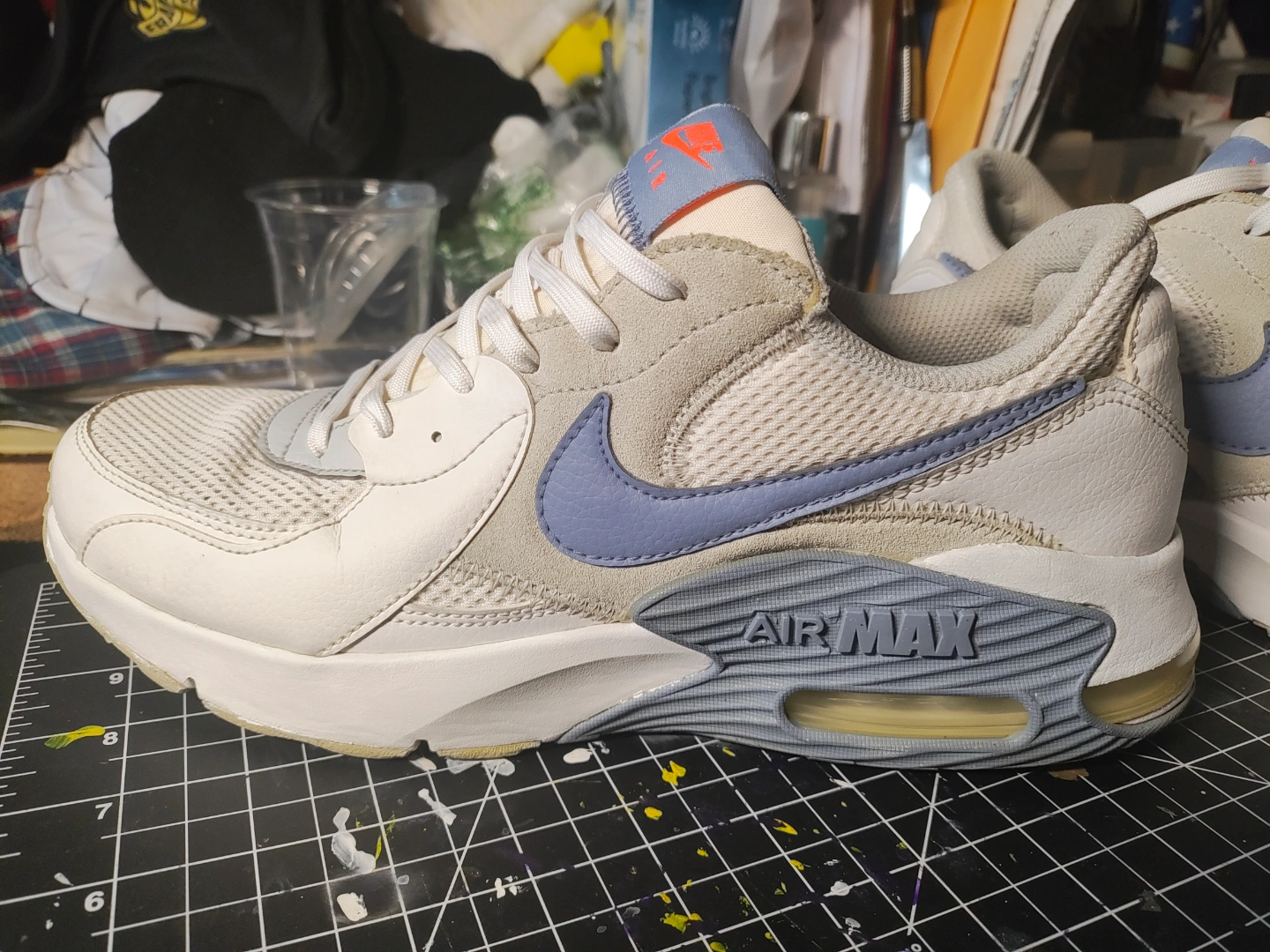 Pair of Nike Air Max 90 Excee sneakers. White, grey, and Indigo accents. Slightly worn, but still wearable. Classic design, comfortable fit.