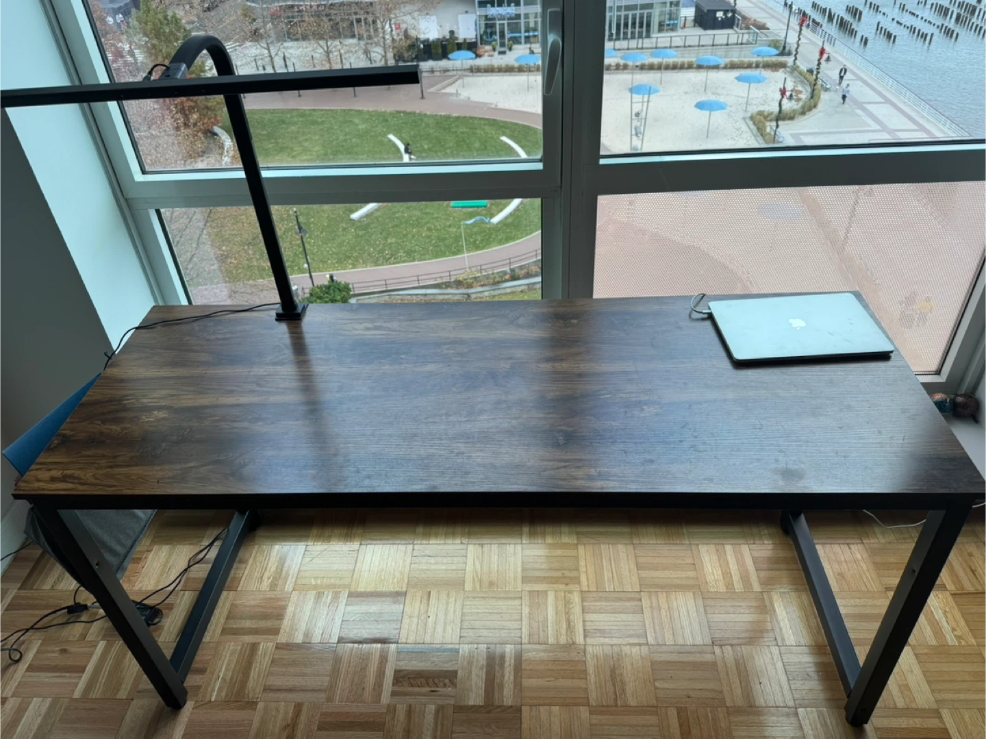 70” long (over 6 feet!) study desk with a ton of surface area to hold multiple laptops and monitors (I used 4 at a time)! Side pocket can hold a lot of dossiers and there’s a hook on the side (a little dented) to hang your bag.