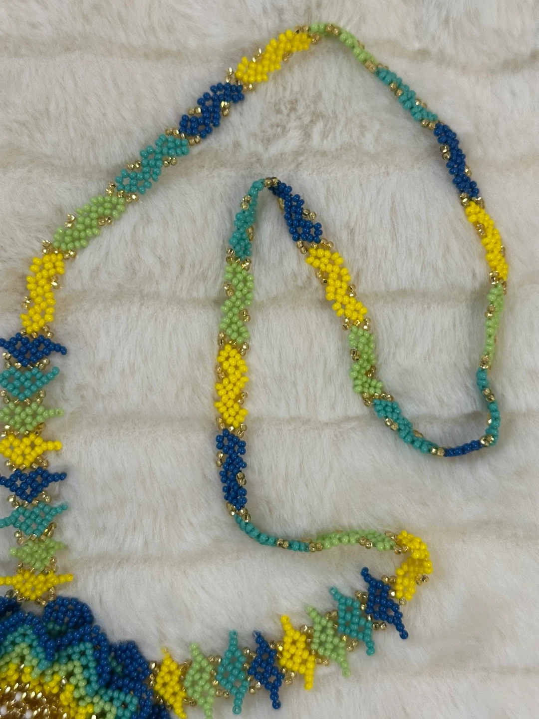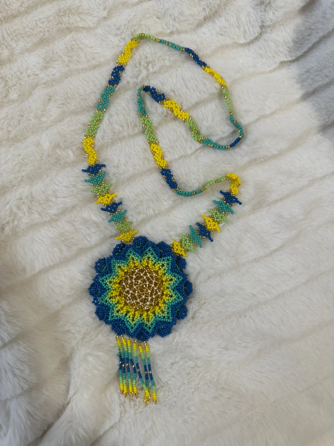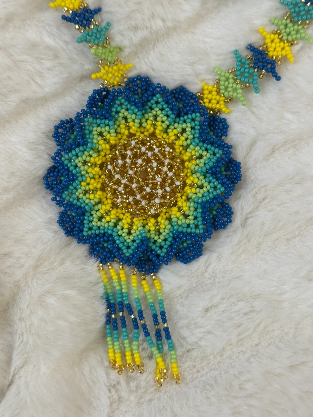This handmade necklace features a vibrant beaded flower pendant. It's strung with colorful beads in blue, green, and yellow with gold accents. Perfect to add a unique style to any outfit.