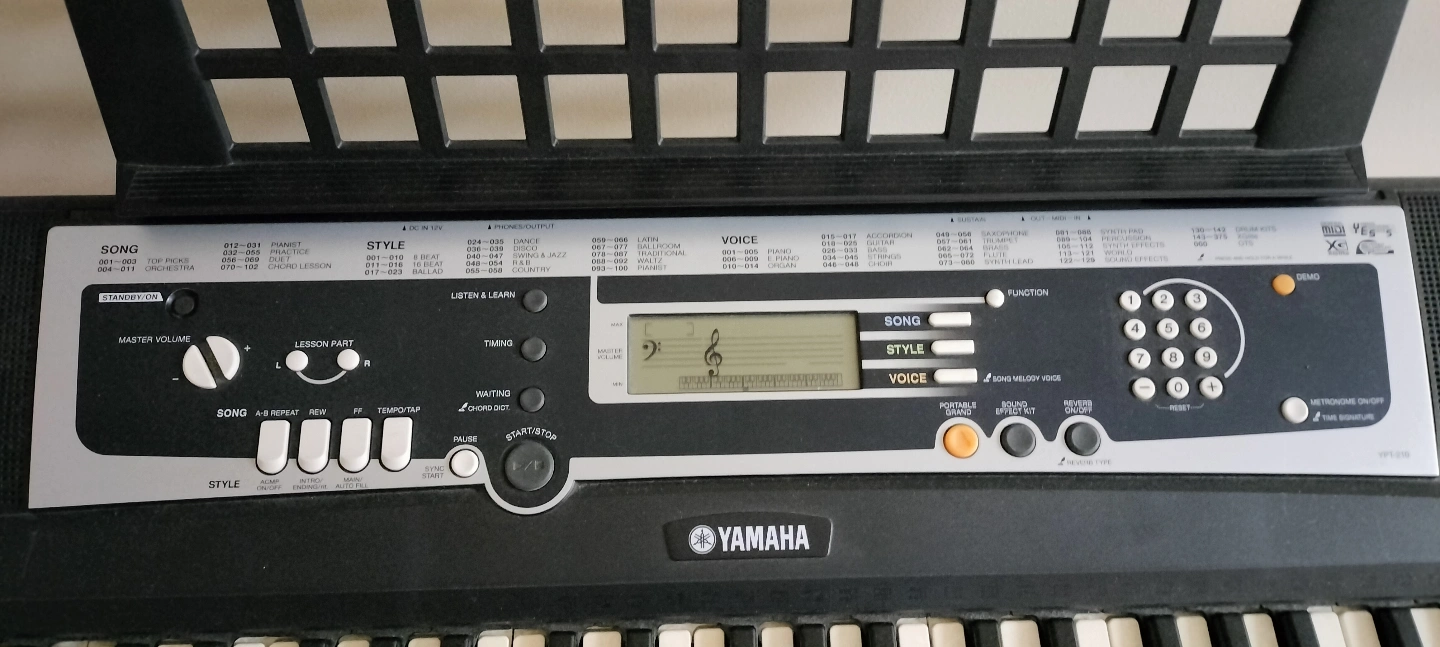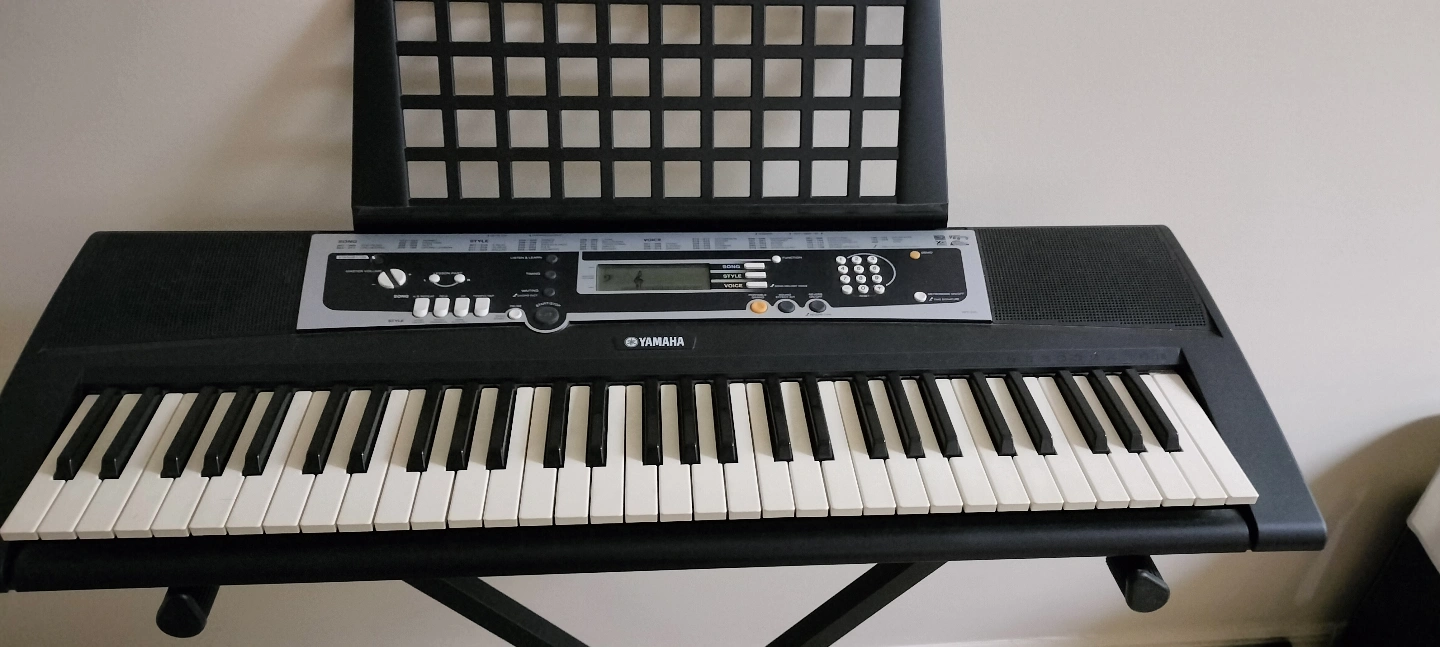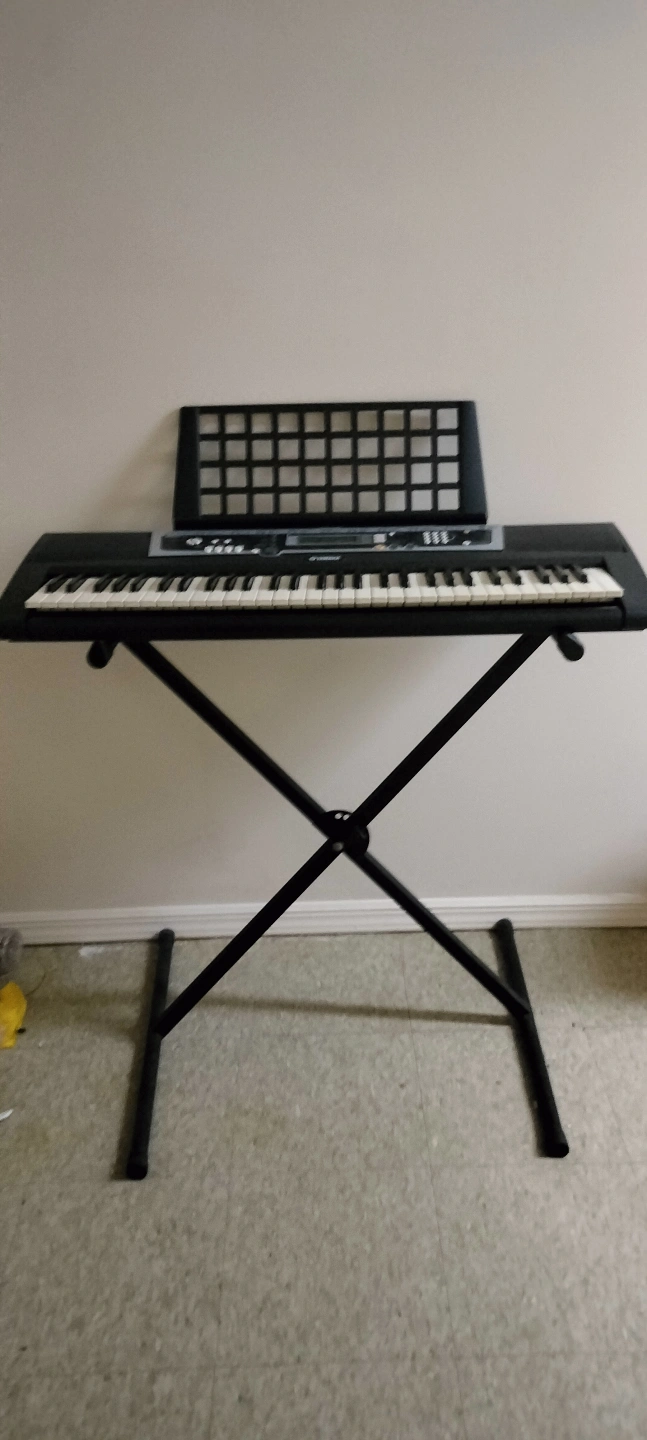 61-key portable keyboard. Includes stand. Features various voices, styles, and songs. Great for beginners or casual players.