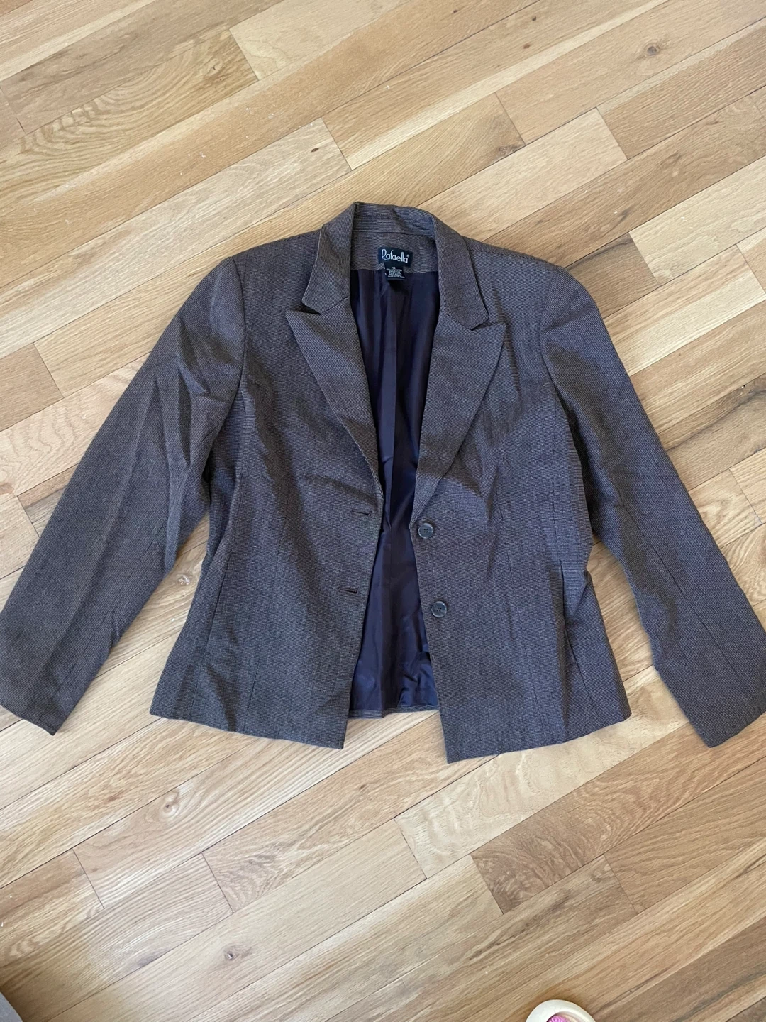 This is a women's blazer from Rafaella. It's a dark gray color with a subtle pinstripe pattern. The blazer features a two-button closure and a satin-like lining. It's a classic cut, suitable for professional or casual wear.