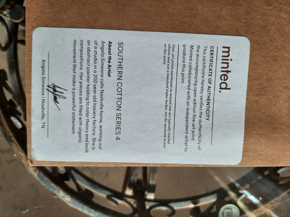 Selling a framed art piece from Minted's Southern Cotton Series 4. This piece features abstract elements and bold compositions, reflecting organic movement. Approx 6"×8". It's a statement piece ready to enhance any room!