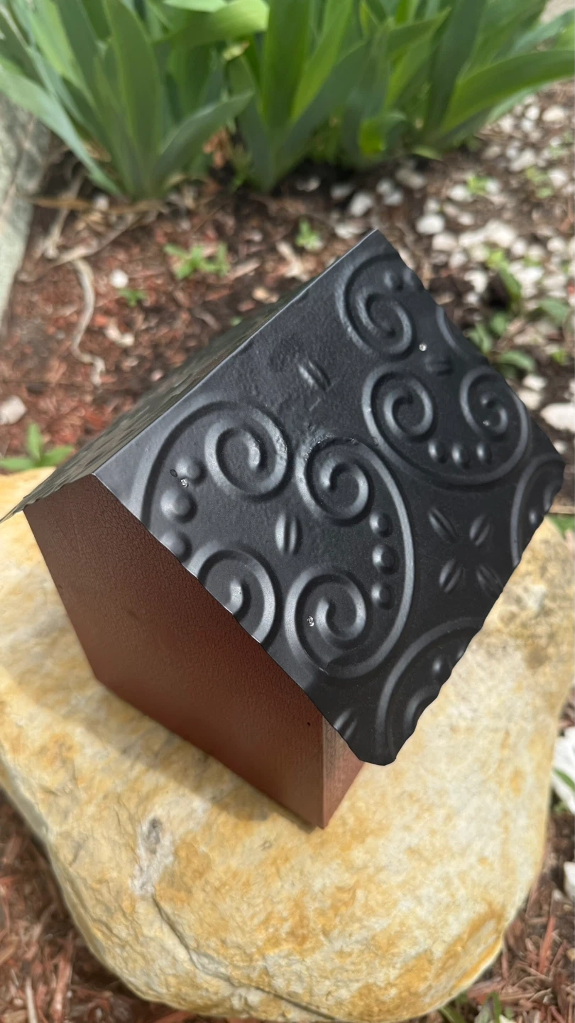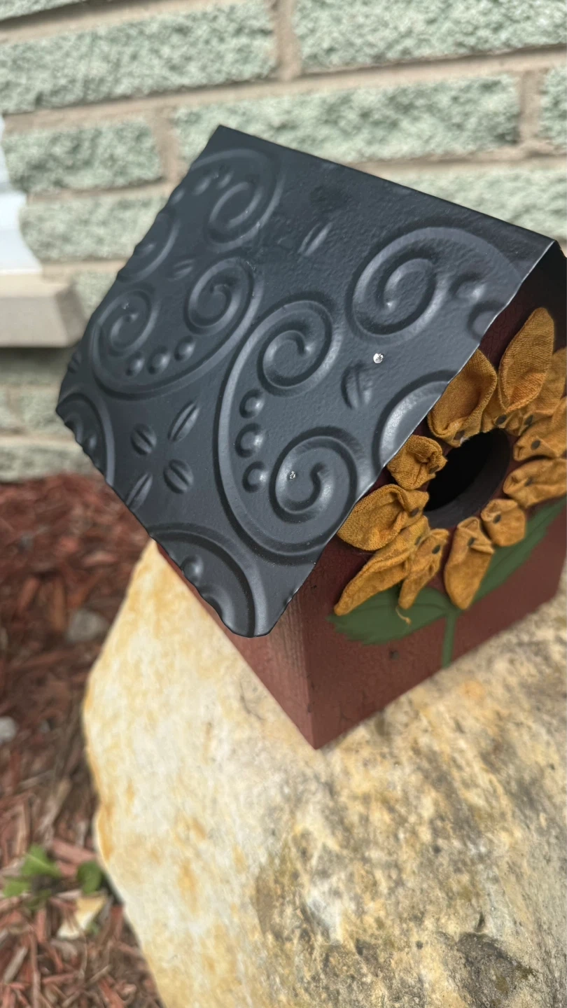 This charming birdhouse features a rustic maroon exterior with a large, eye-catching sunflower decal on the front. It has a black, textured roof with embossed scrollwork. This decorative piece would be a lovely addition to any garden or outdoor space!