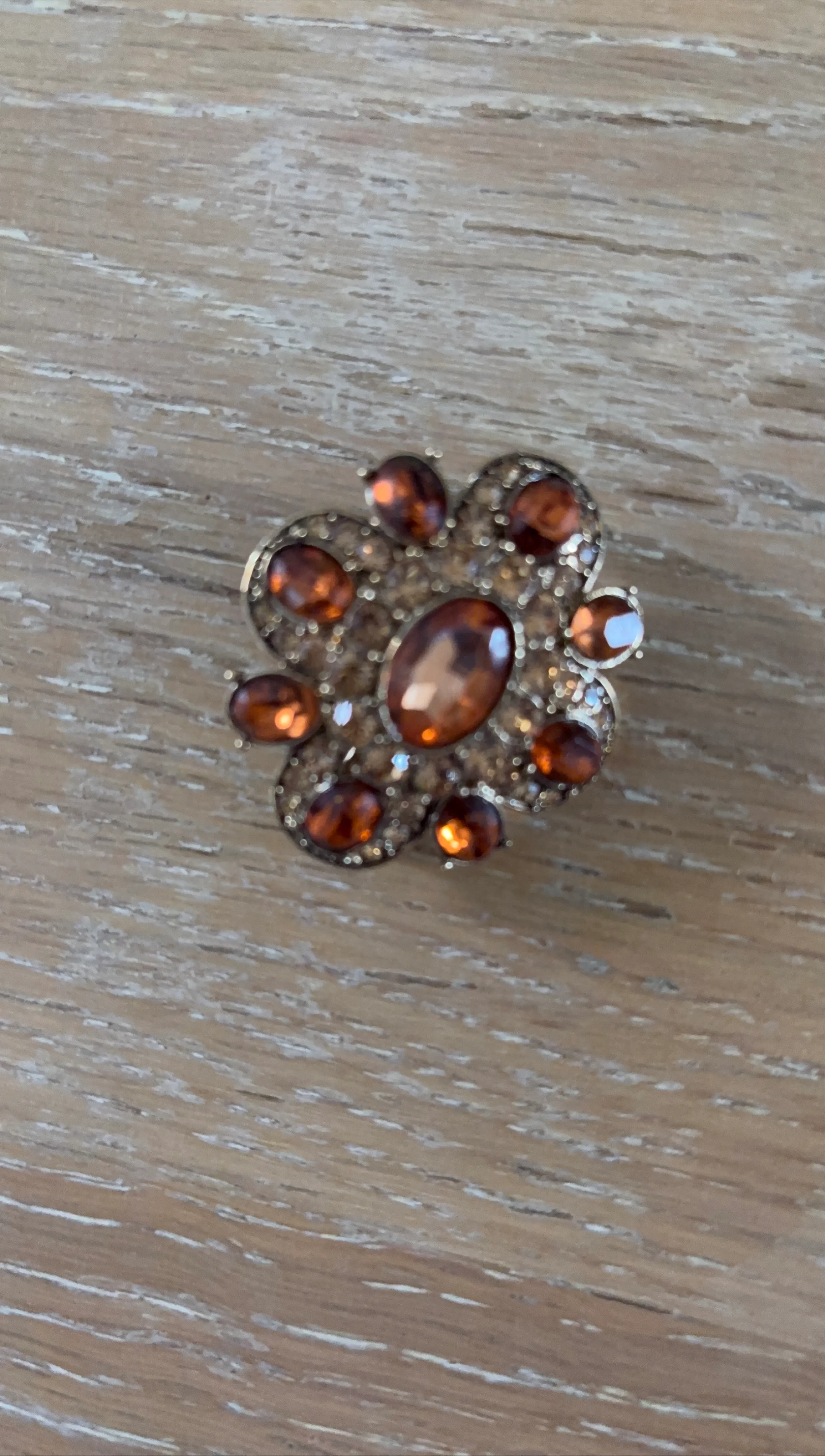 Features an arrangement of amber-colored stones. The setting appears to be gold-toned metal. A classic and beautiful brooch, ideal for adding charm to any outfit.