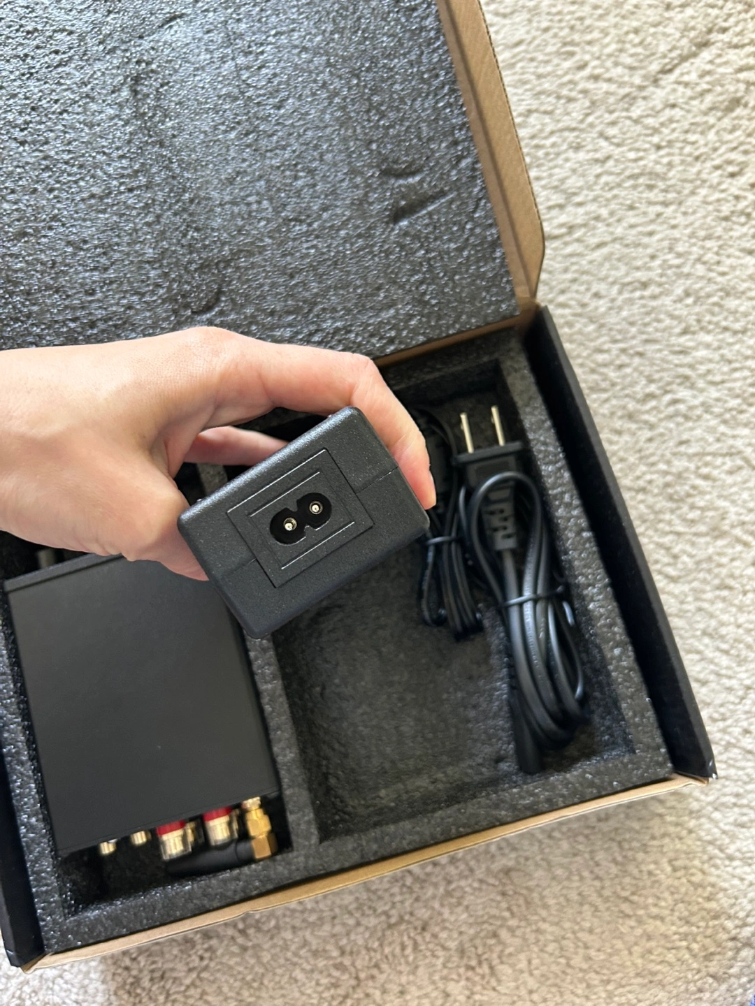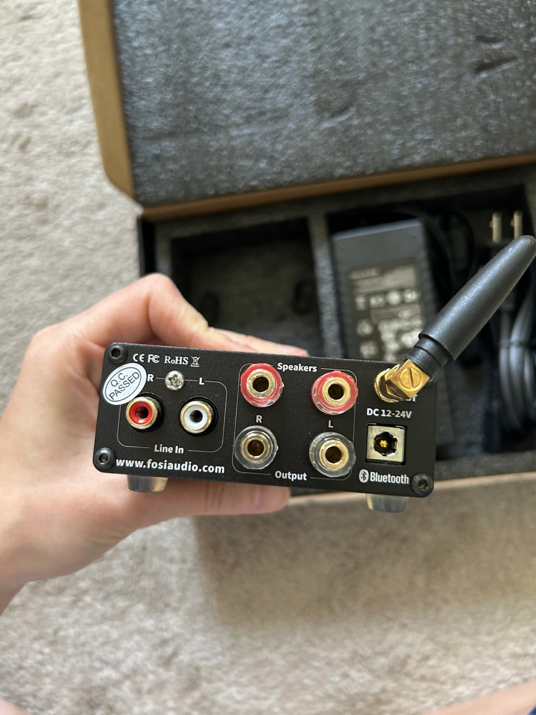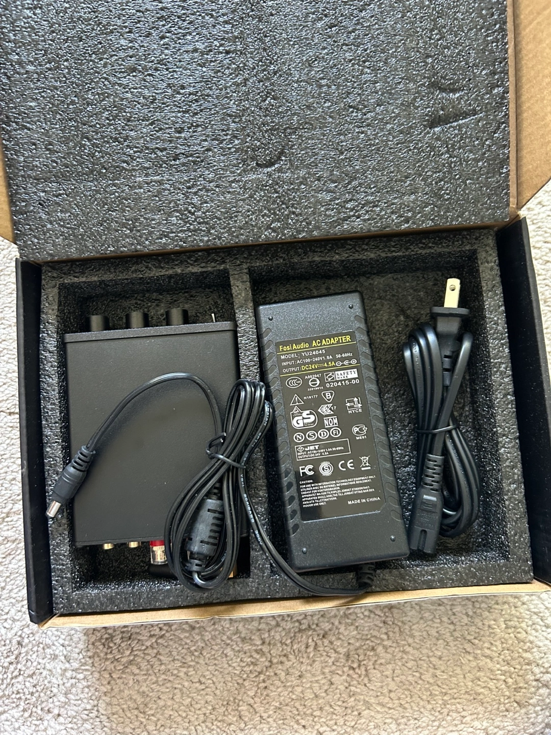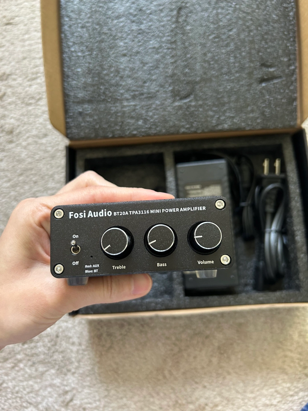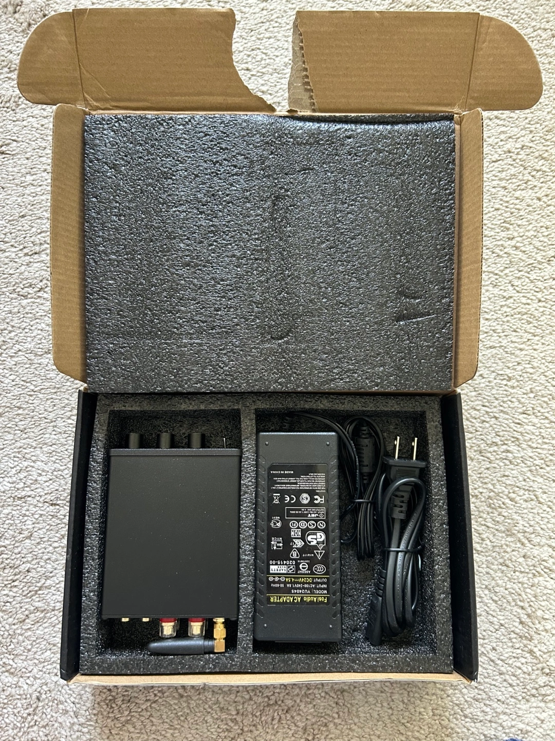 A Fosi Audio BT20A TPA3116 mini power amplifier! It comes with its original box and included components like the power adapter. It's in great condition and ready to amplify your audio experience. I don’t know how to use this, so no technical questions pls lol