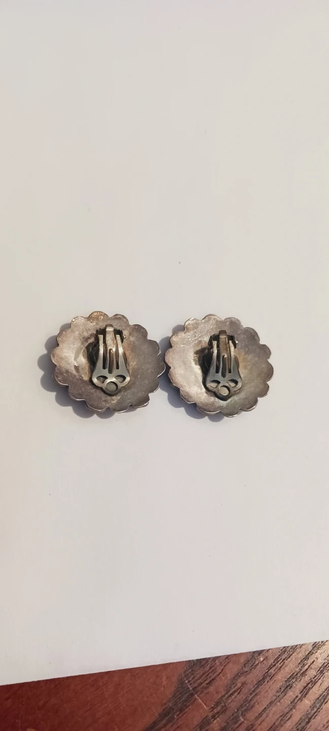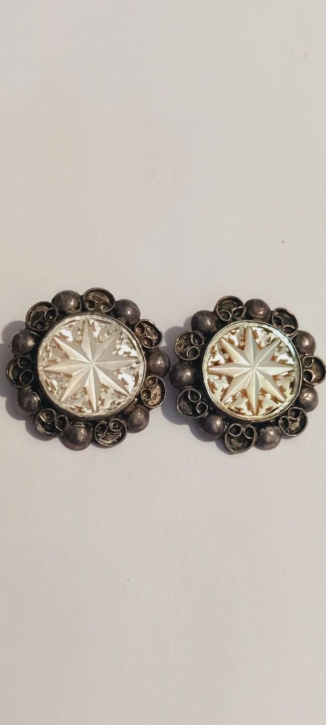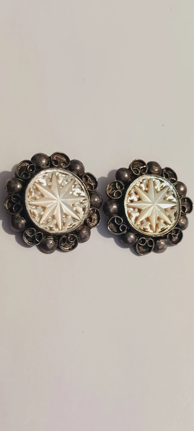 Sterling Silver 925 Jerusalem Gorgeous 1950s Vintage Handcrafted Filigree Hand Carved Mother of Pearl pointed Jewish stars design clip on earrings. These earrings feature carved mother of pearl centers with a Stars design. They're set in ornate sterling silver 925 filigree. They're clip-on style earrings. 1" diameter. Handmade in Jerusalem, Israel. Excellent condition. ALL MY PRICES ARE NEGOTIABLE !!