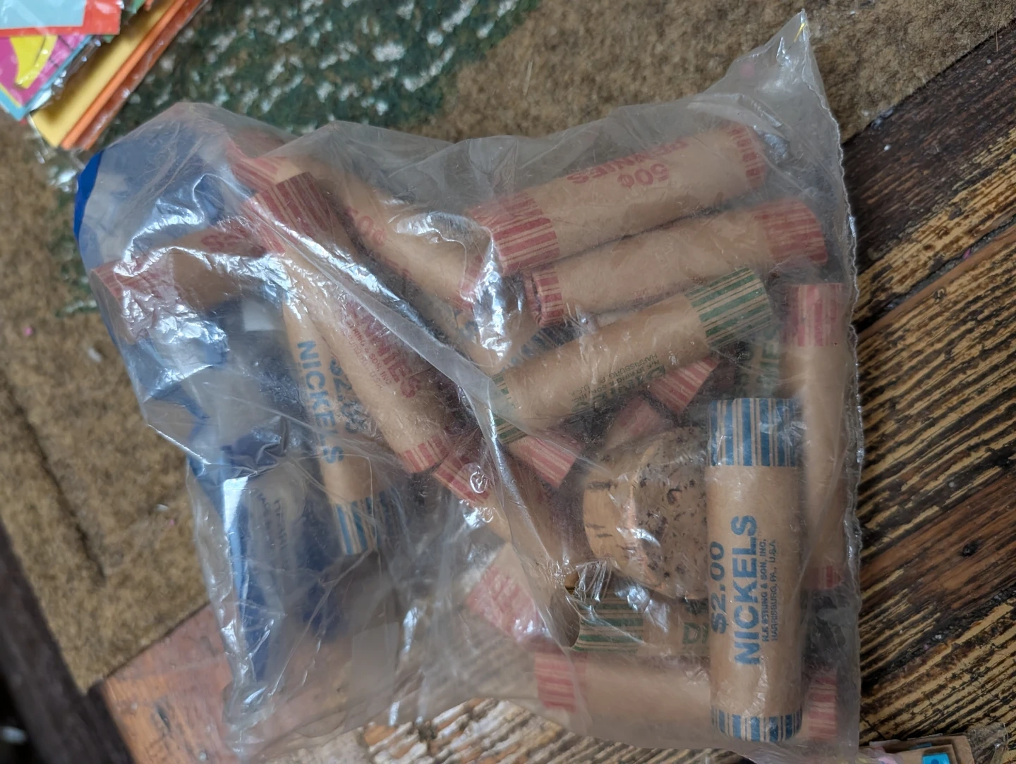 Bag of coin rolls including pennies and nickels. Some rolls are for 50 cents (pennies) and others are for $2.00 (nickels). Rolled by S.D. Warren Company and H.S. String & Son, Inc. USA.