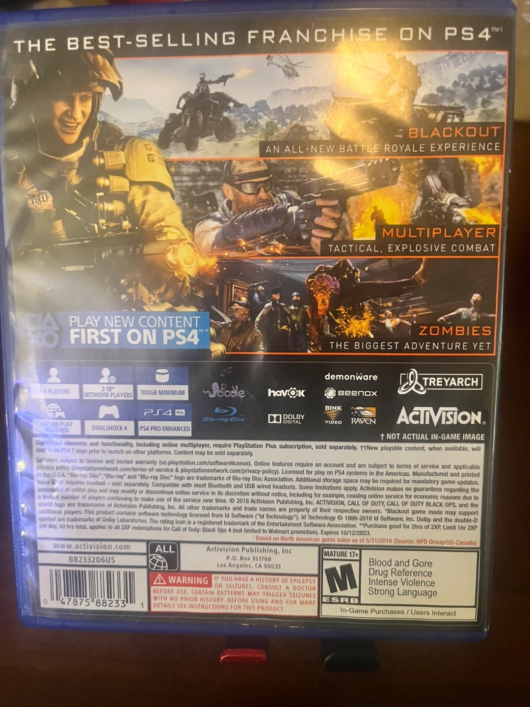 This game includes the Blackout battle royale experience, multiplayer, and zombies mode. It requires internet connection for gameplay. Published by Activision and developed by Treyarch.