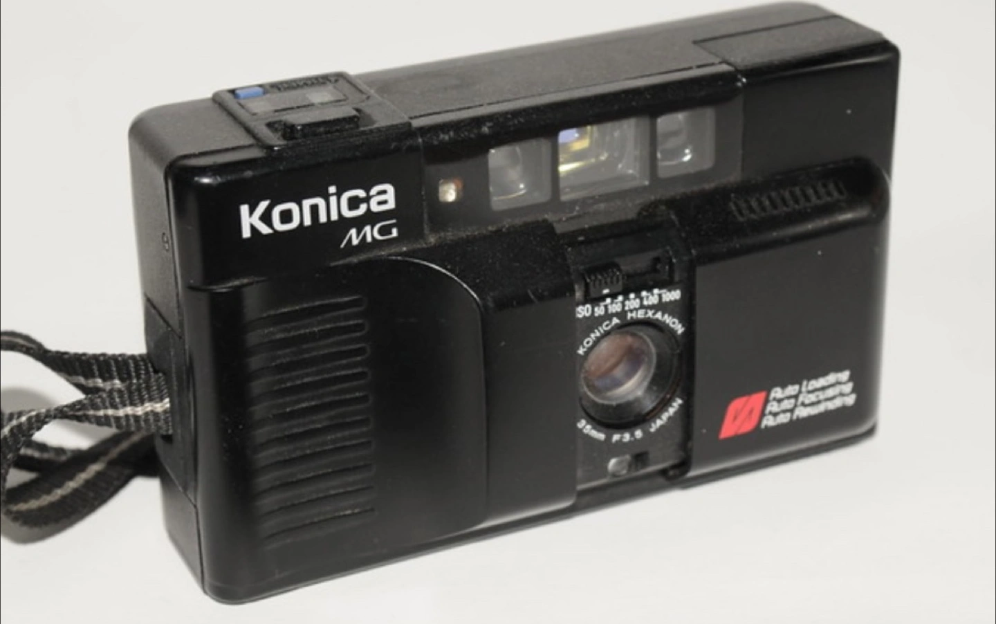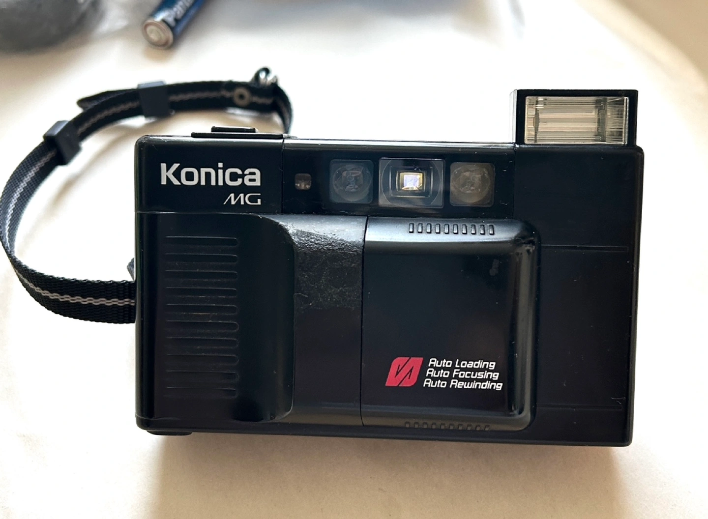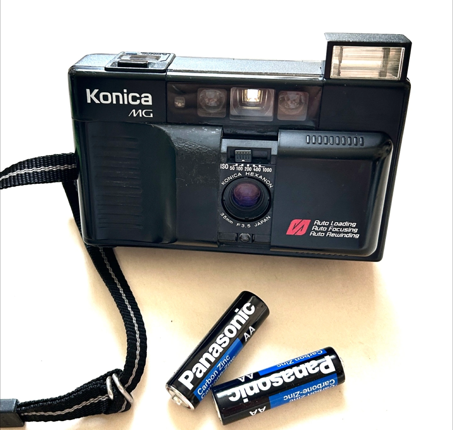 Konica MG 35 mm point and shoot film camera. Vintage auto load/ auto focus/ auto rewind. Built-in Flash. Takes two AA batteries.? Fully functional, tested and all parts working. Minor scuffs and scratches to surface from years of use. But camera is fully operational.