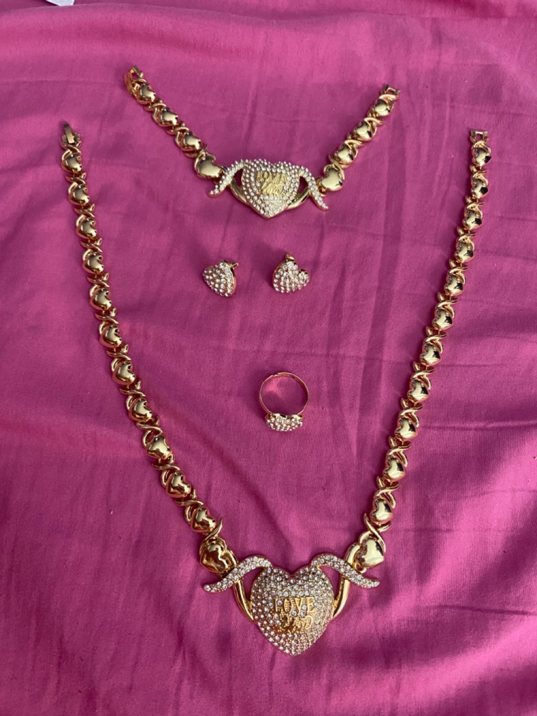 Gorgeous gold-tone necklace, bracelet, earrings, and ring set. Heart-shaped pendants and charms feature sparkling accents. Perfect for a special occasion or everyday wear.