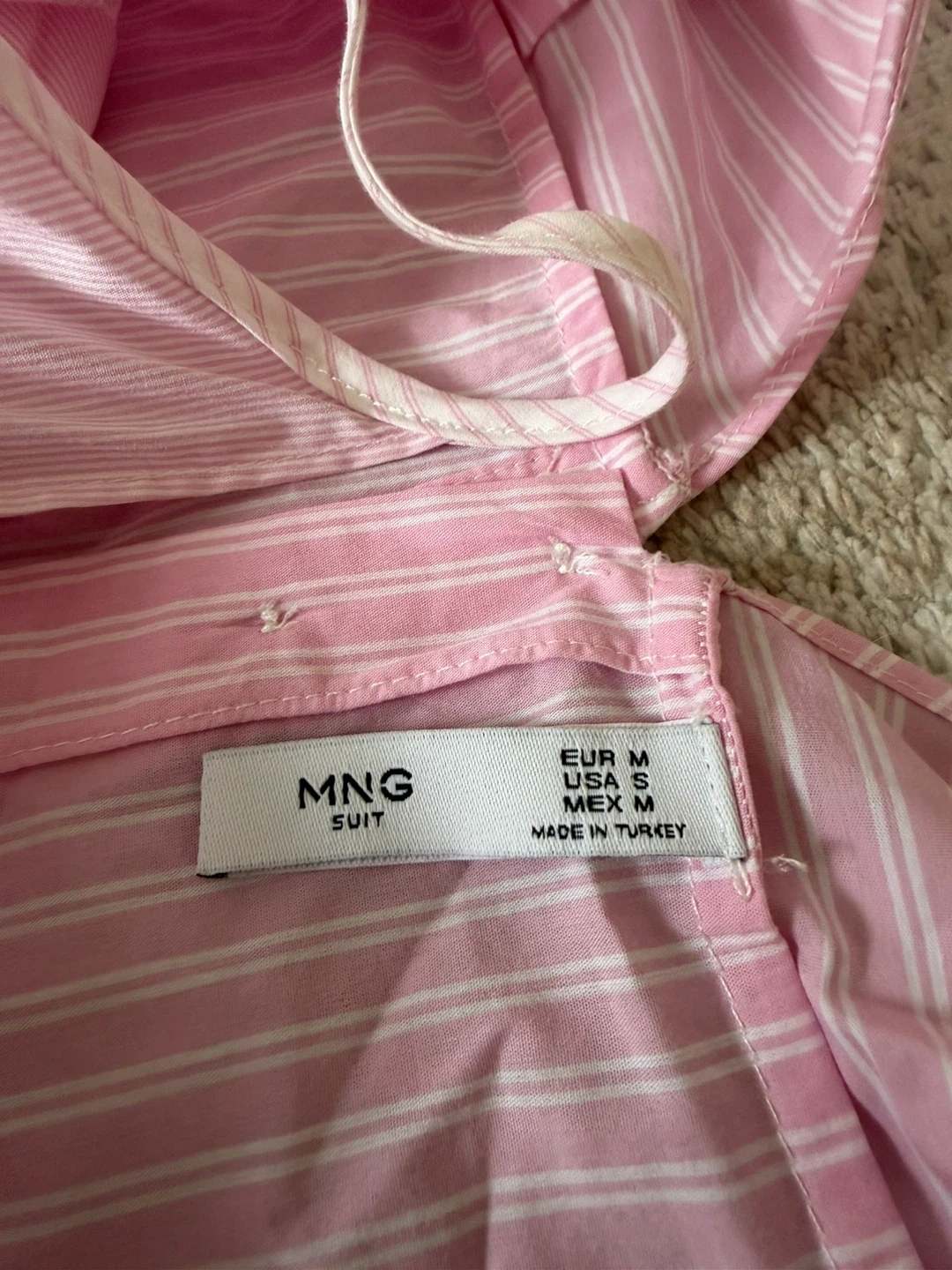 Selling a cute MNG Suit top in a light pink and white striped pattern