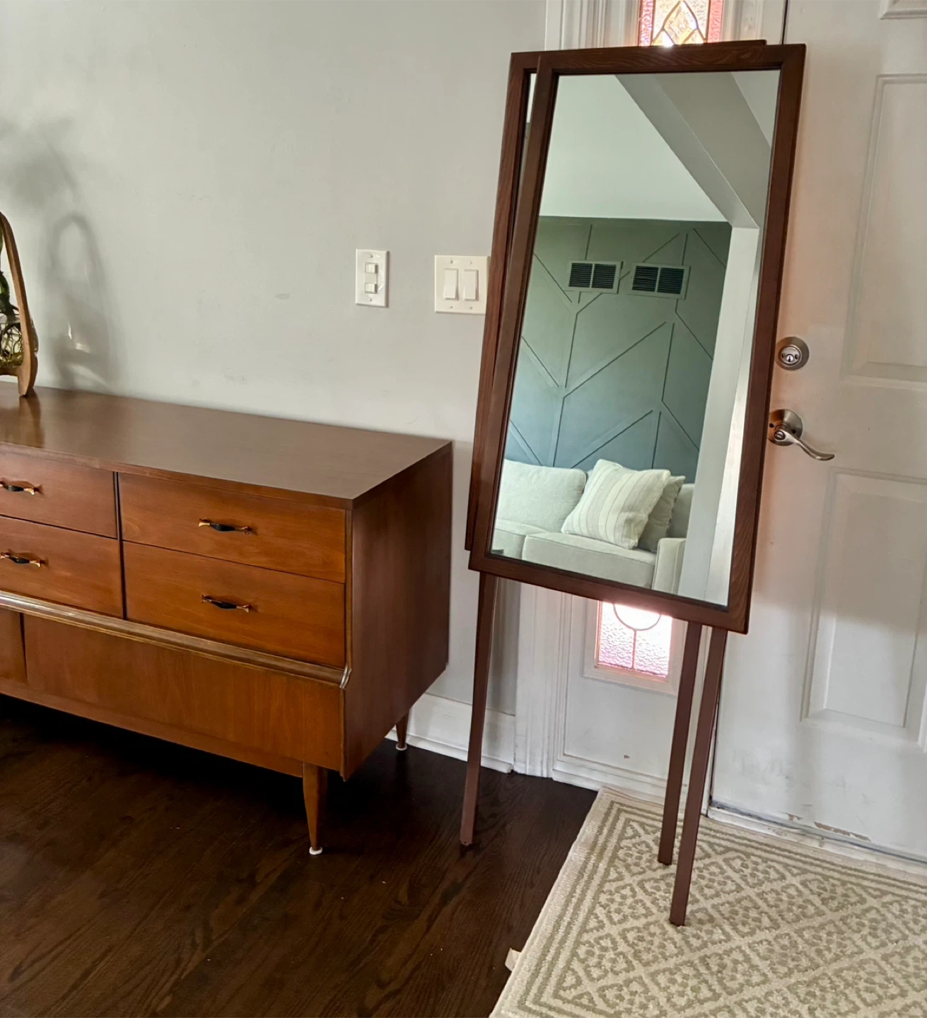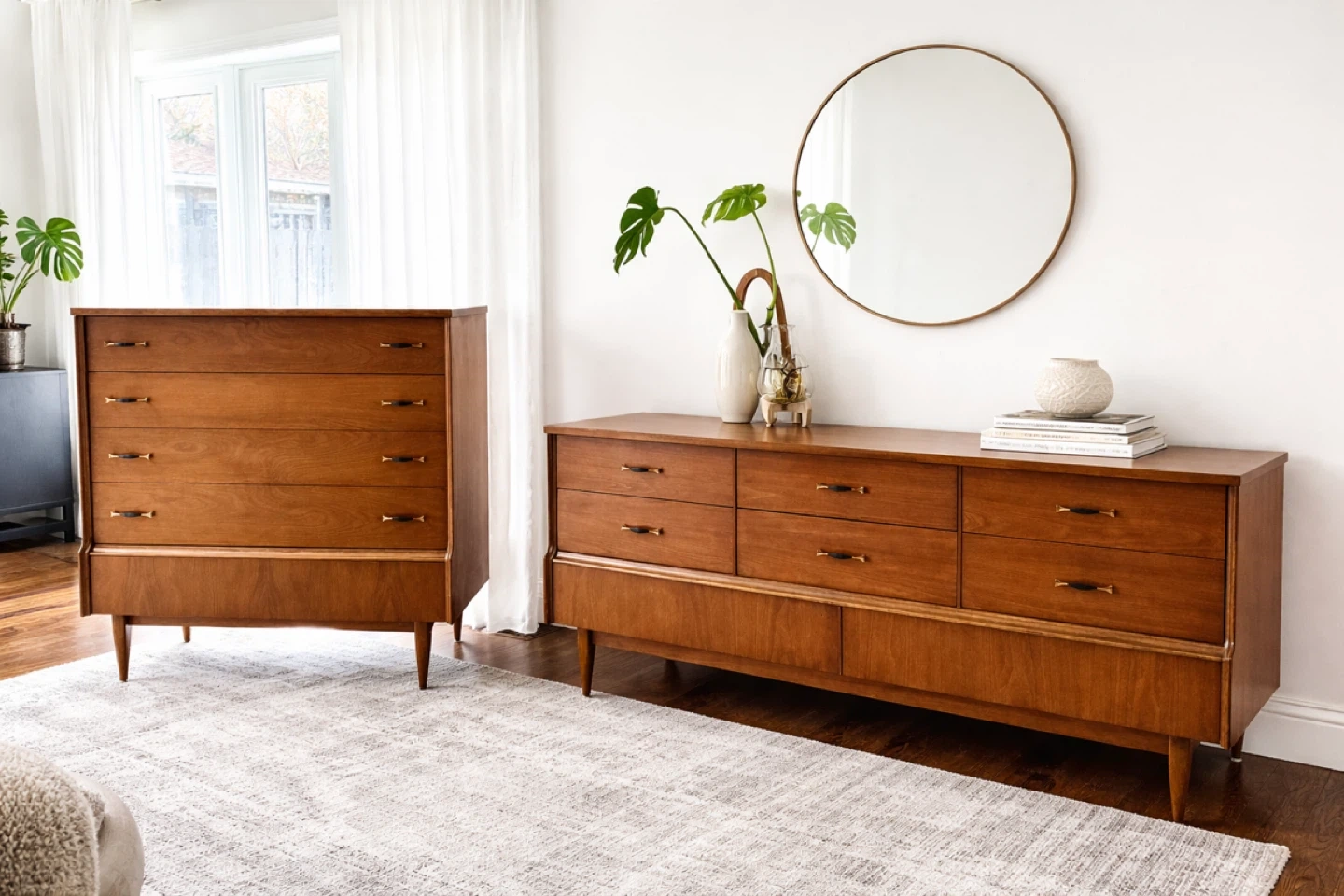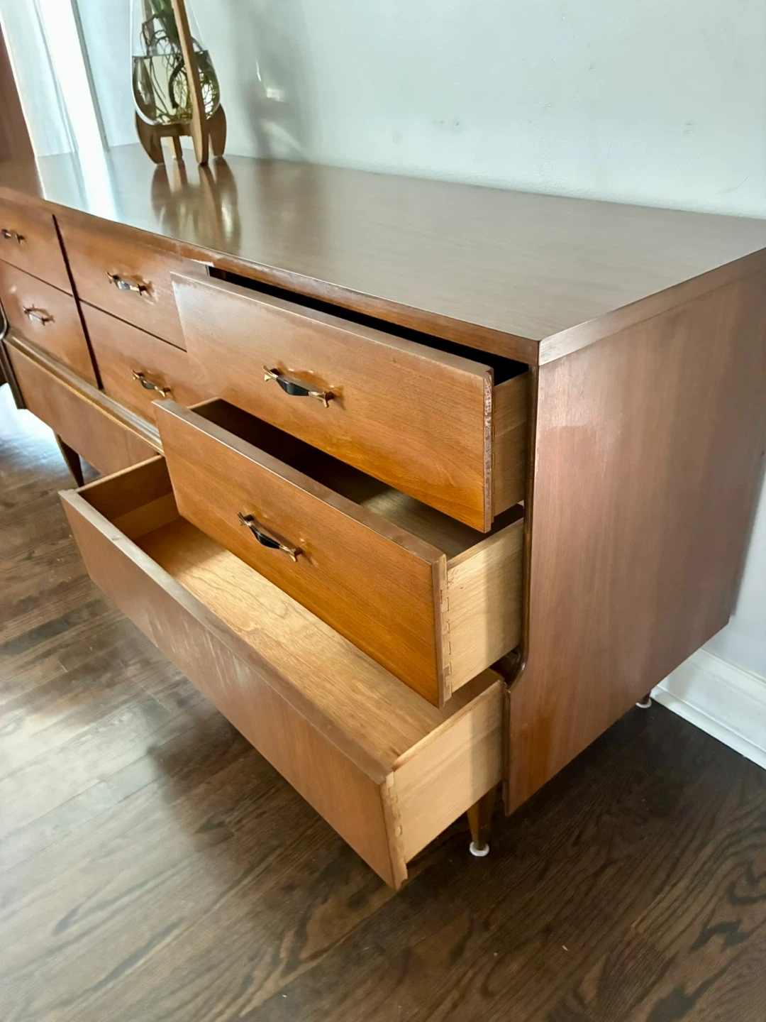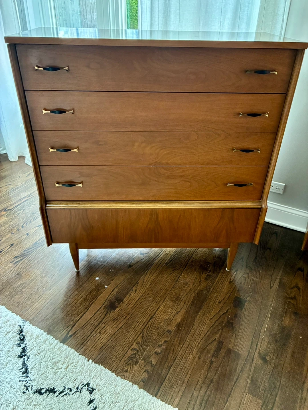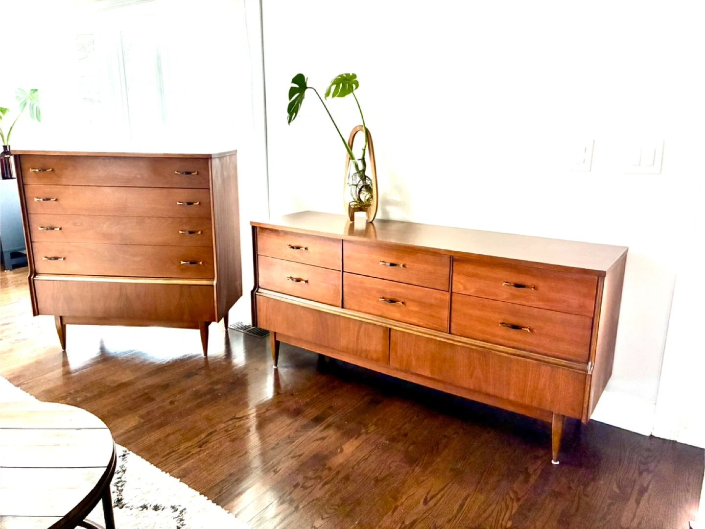 Mid century modern set: low dresser, two mirrors, and tall dresser all of the pieces in great vintage condition. Pictures doesn’t make justice for this set!
