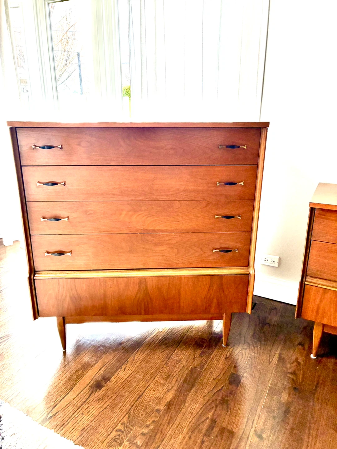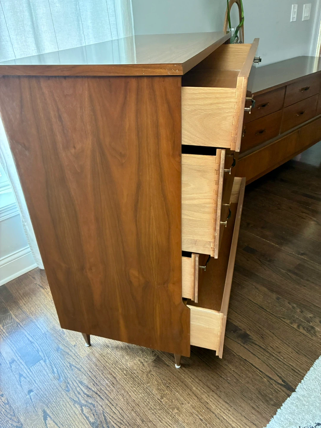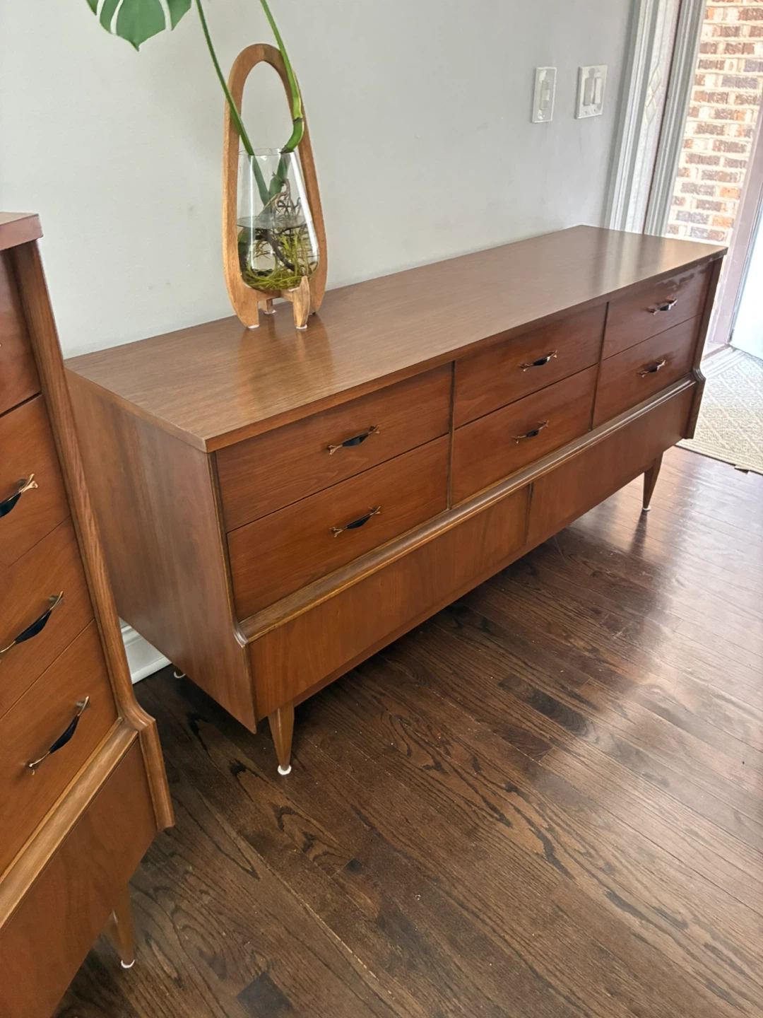 Mid century modern set: low dresser, two mirrors, and tall dresser all of the pieces in great vintage condition. Pictures doesn’t make justice for this set!