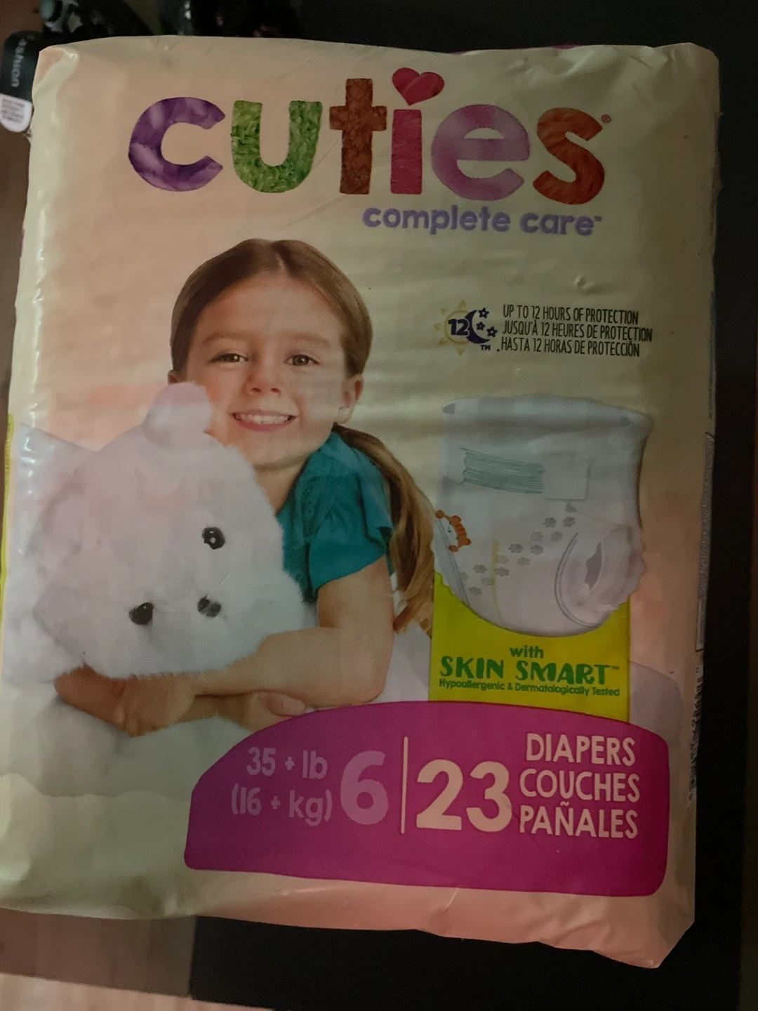 Cuties Complete Care diapers offer up to 12 hours of protection. They feature Skin Smart, are hypoallergenic, and dermatologically tested. These are size 6 diapers, suitable for 35+ lbs (16+ kg).