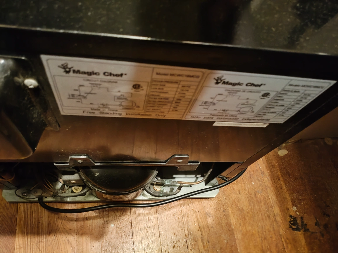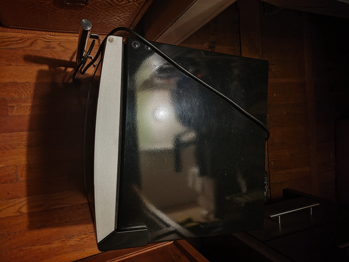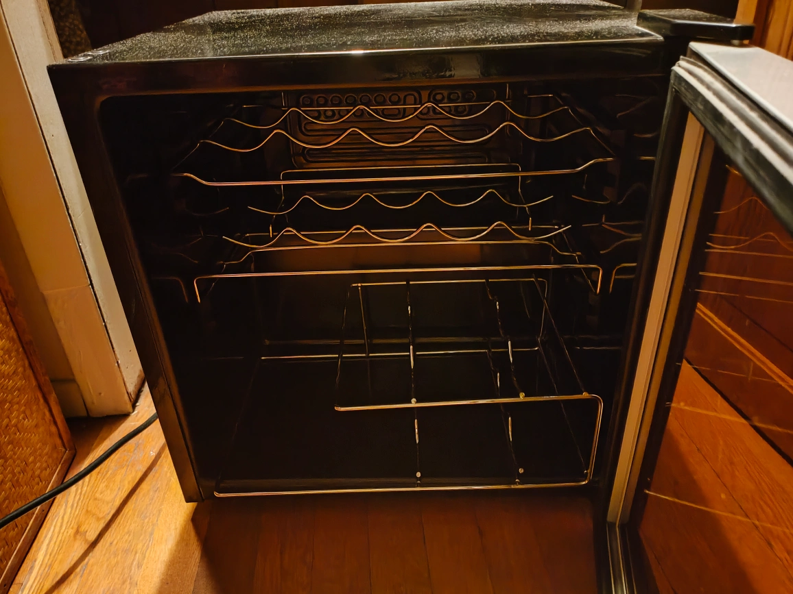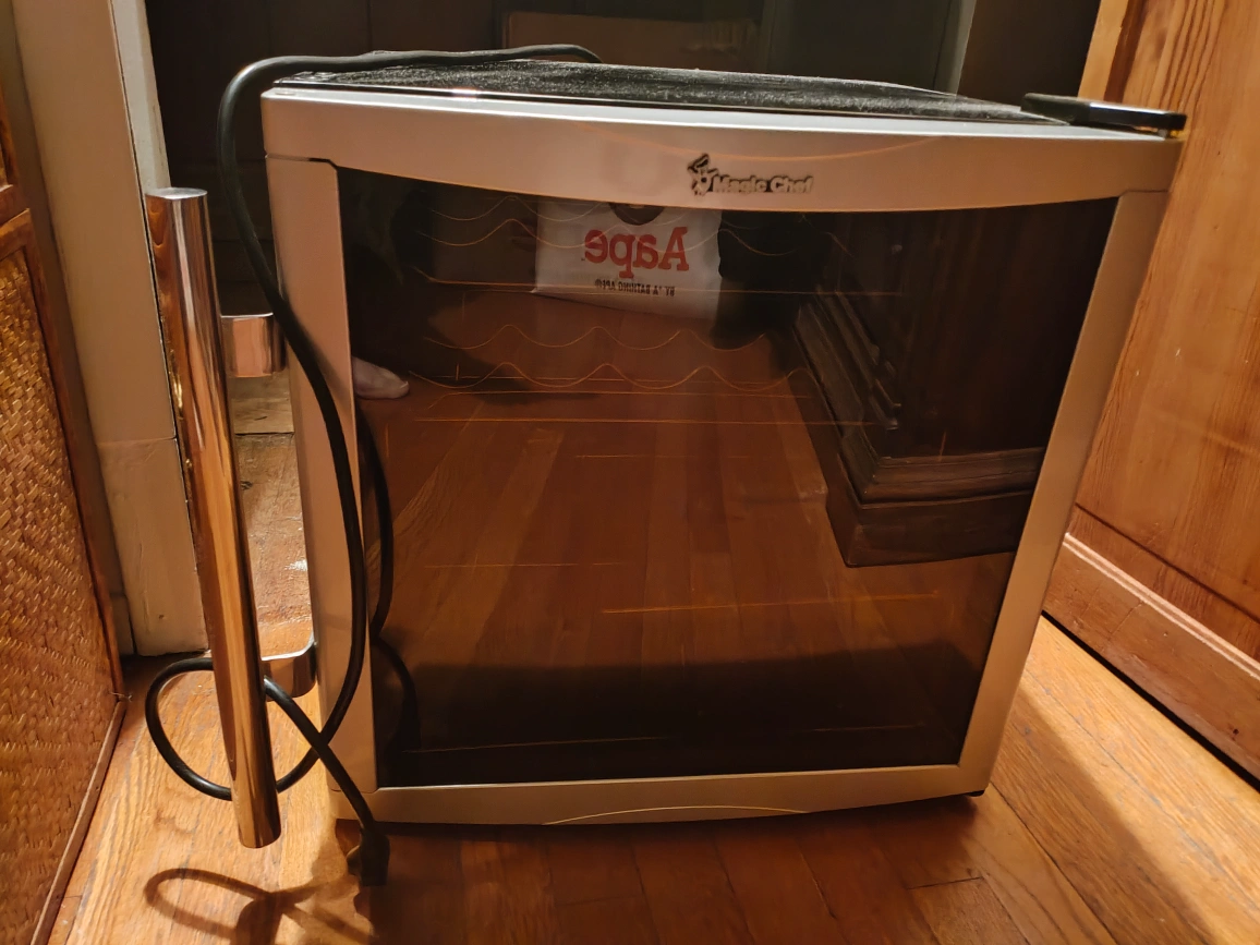 Small wine cooler. Holds approximately 12 bottles. Includes shelves. Has a temperature control dial. Black and silver finish. No dents or scratches.