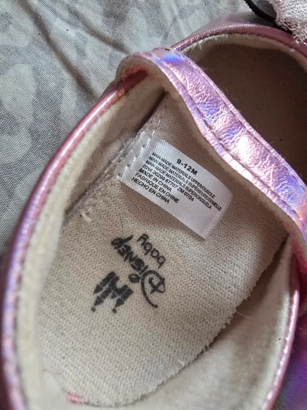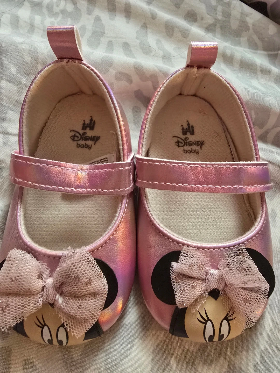 Cute Disney Baby Minnie Mouse shoes in size 9-12 months! They are in good condition and ready for your little one. These adorable shoes feature Minnie Mouse on the front with a sweet bow detail