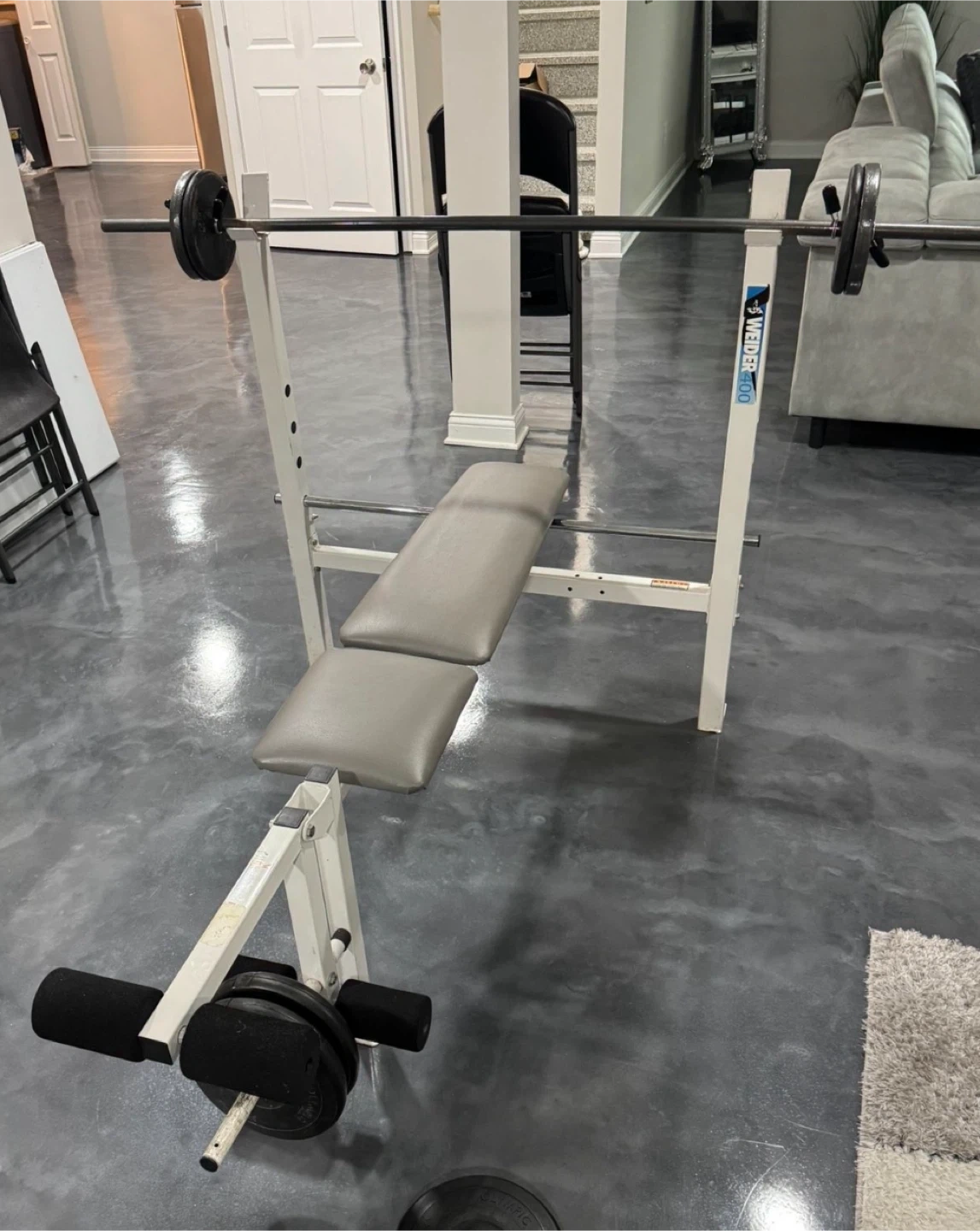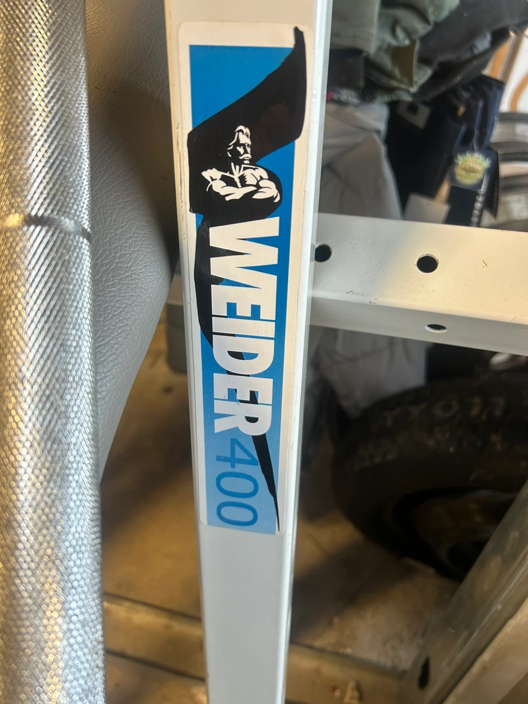 Weider 400 weight bench for sale. Features adjustable backrest and includes leg curl/extension attachment. Short bar with 40 pounds and Olympic bar