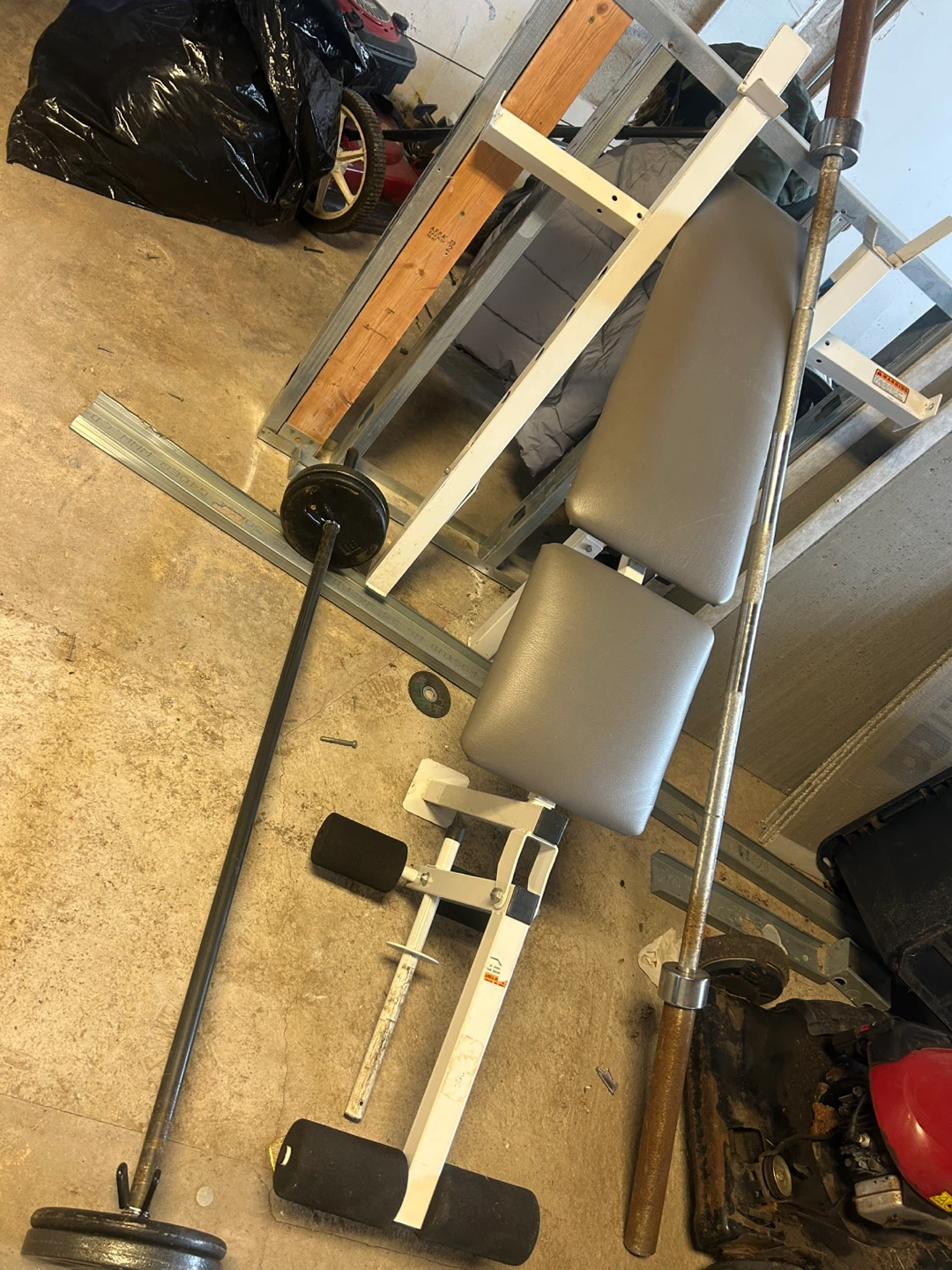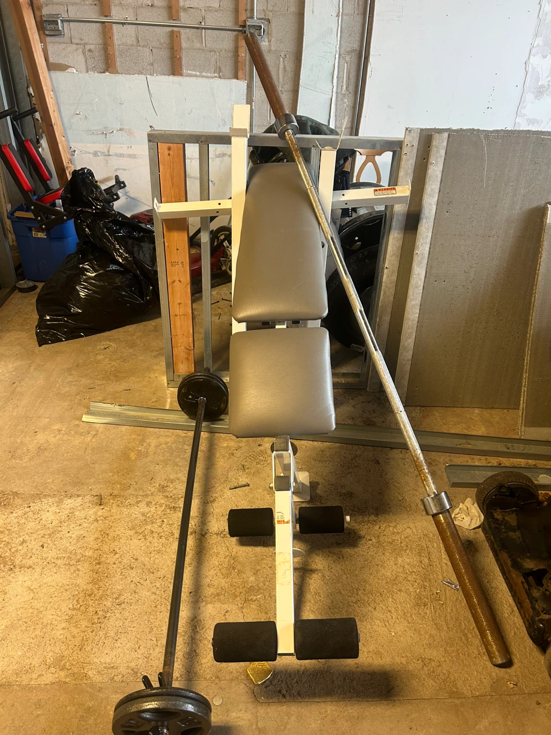 Weider 400 weight bench for sale. Features adjustable backrest and includes leg curl/extension attachment. Short bar with 40 pounds and Olympic bar