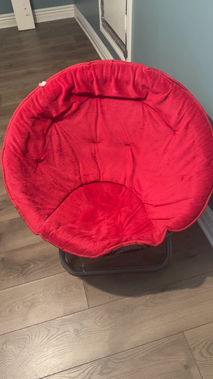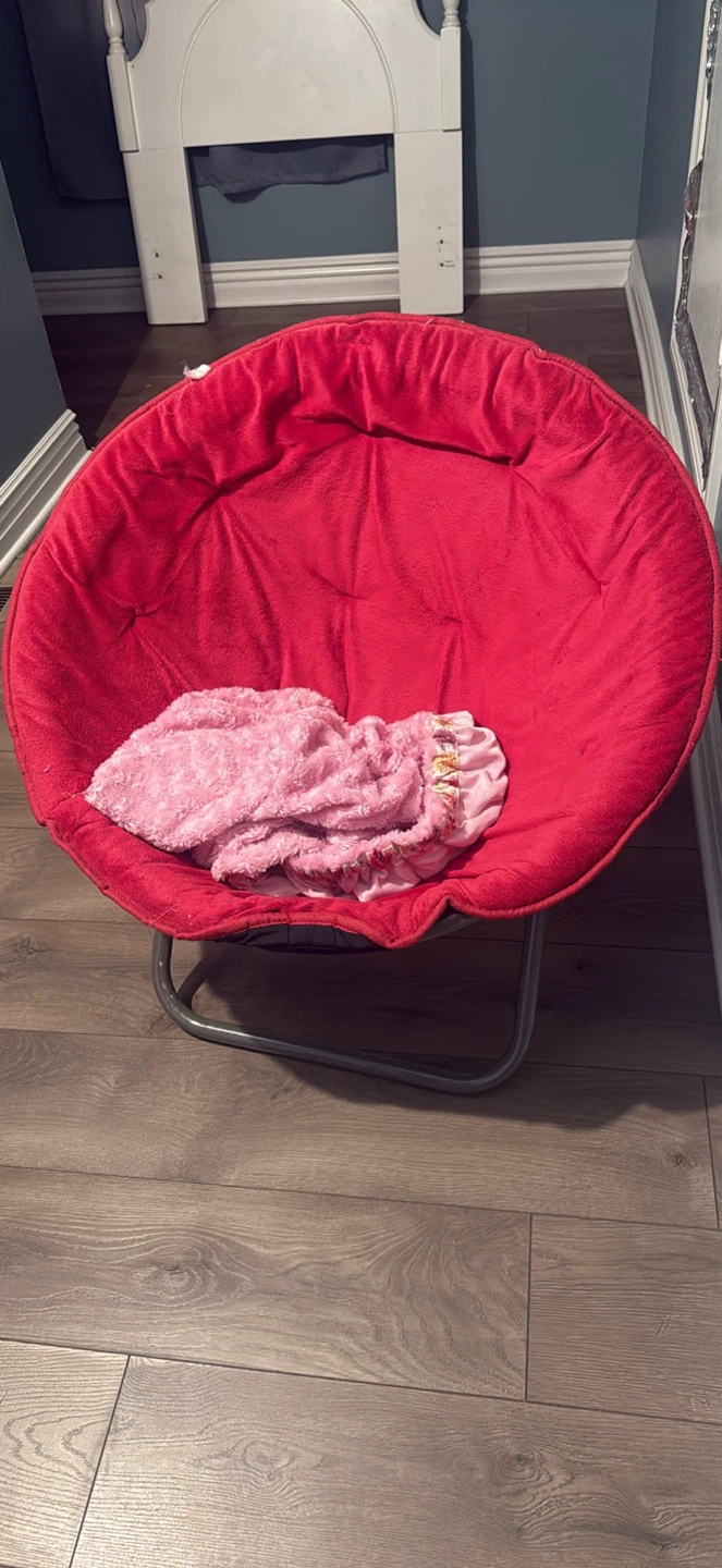 Selling a comfy pink papasan chair! It's in great condition and perfect for adding a cozy touch to any room. The chair features a soft, plush cushion and a sturdy metal frame. Great for relaxing or reading a book!