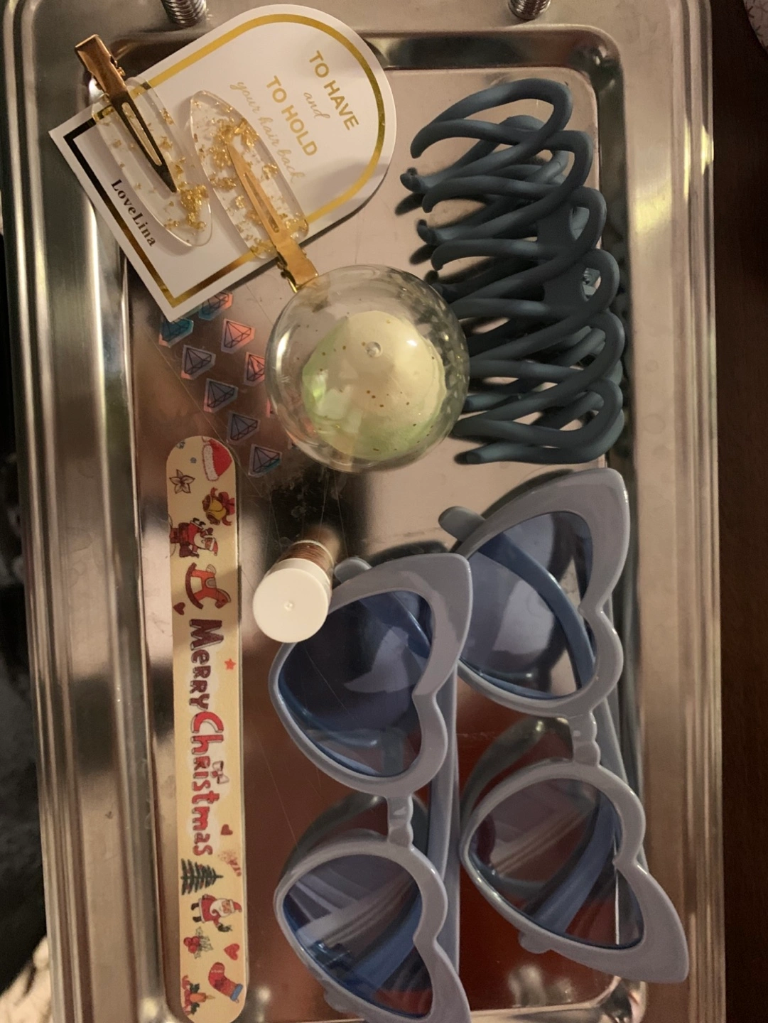 Holiday nail file, makeup sponge,lip balm.