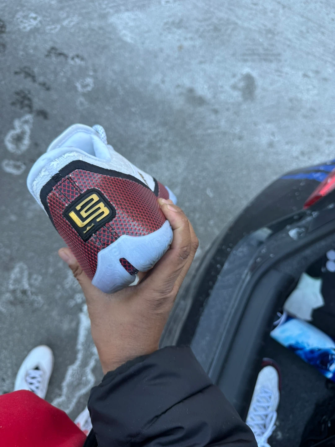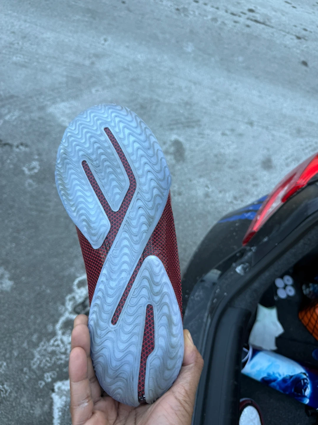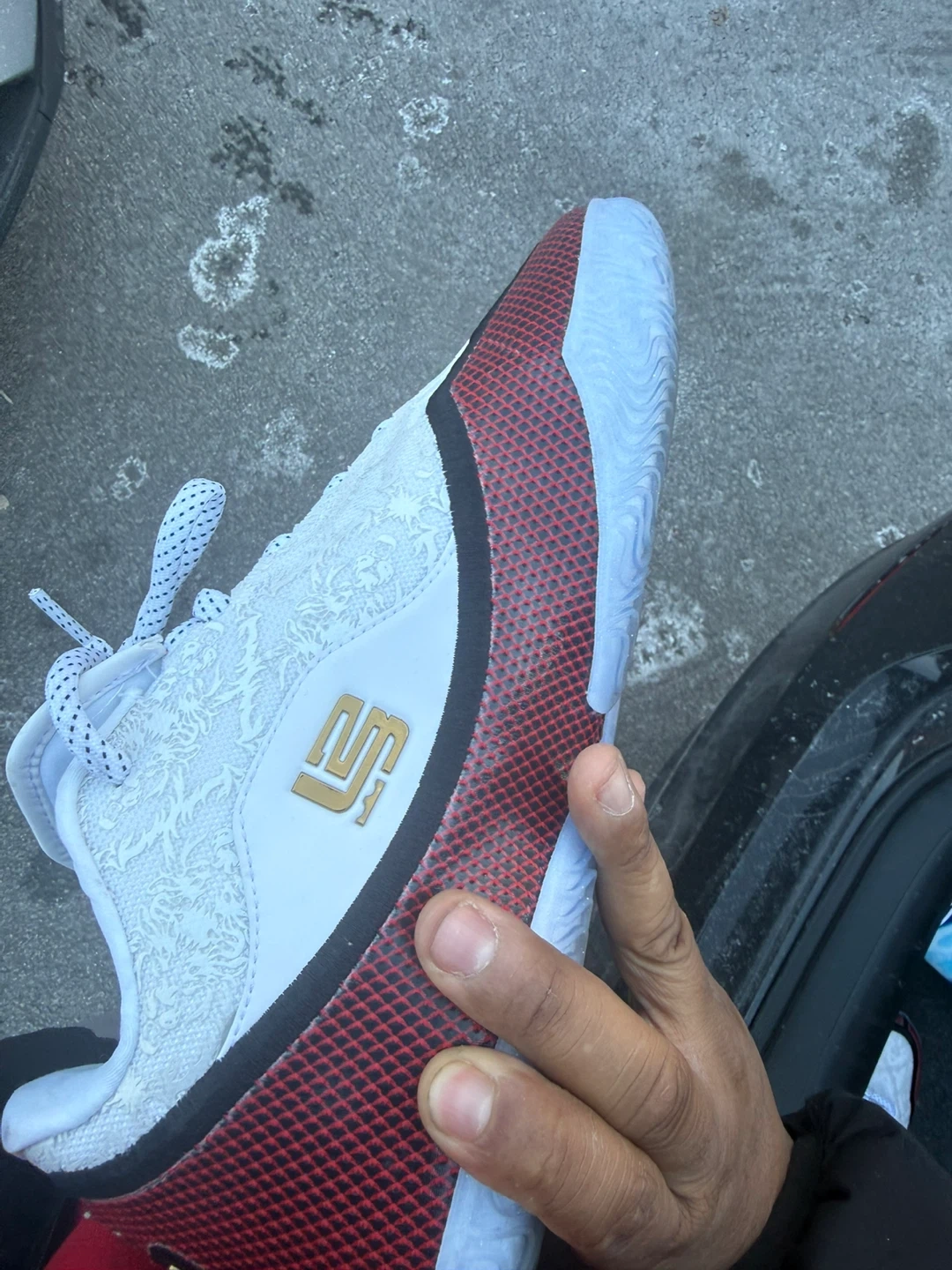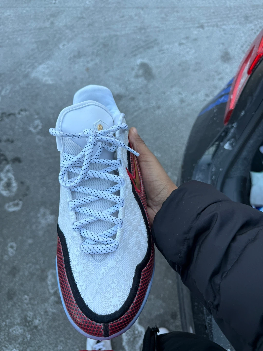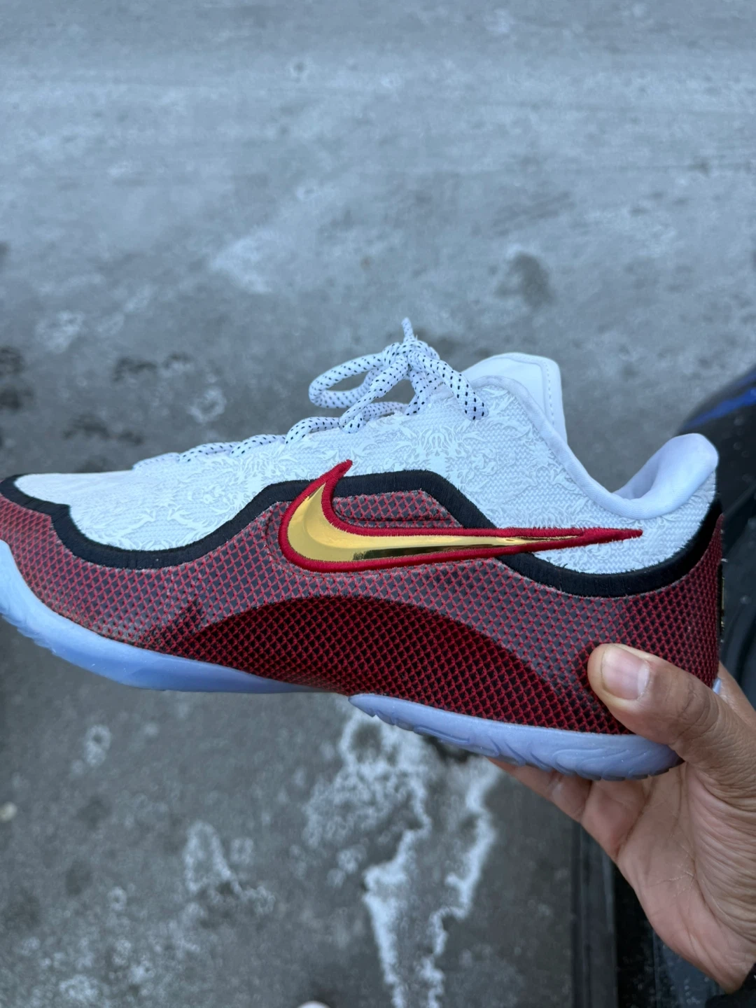 ( i dont have the box , and I wore them once )White and red Nike LeBron Witness 5 basketball shoes. Features a white patterned upper with red and black accents. The sole is light blue. This shoe is designed for performance on the court.