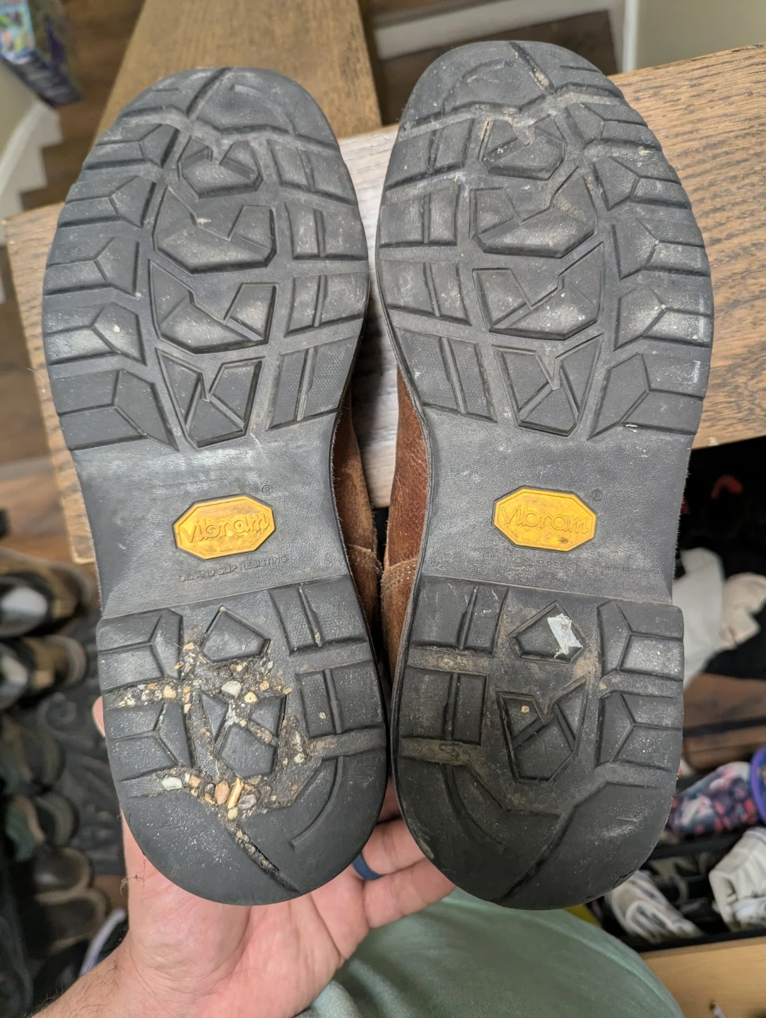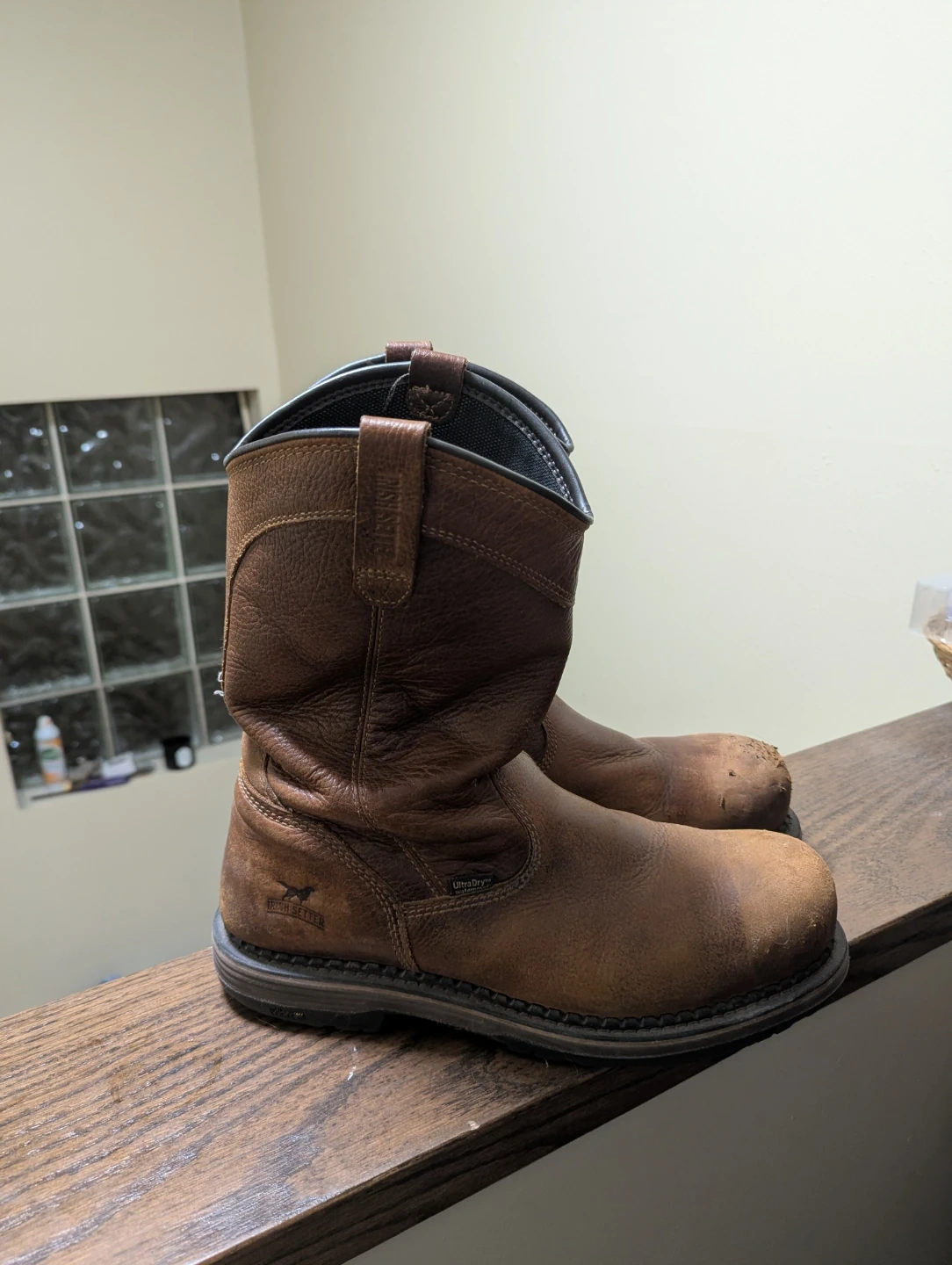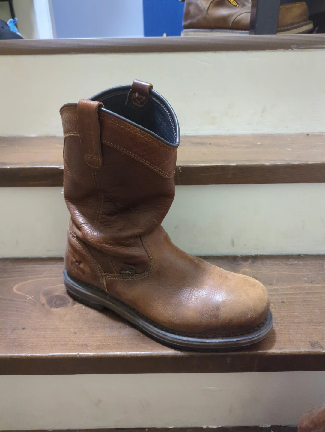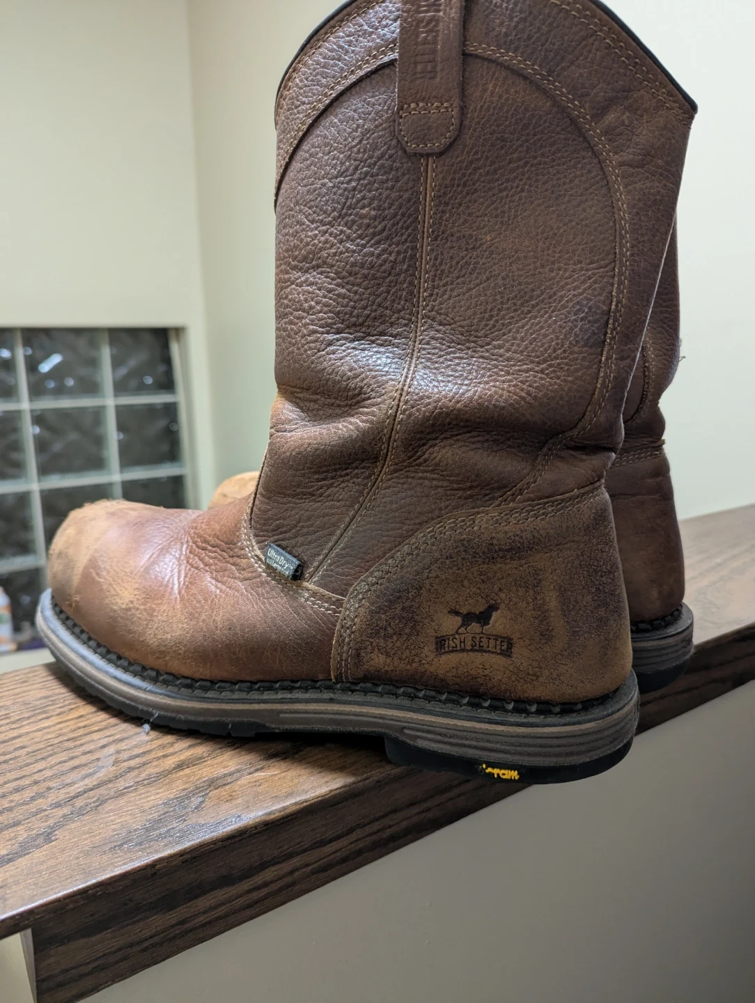 Men's Irish Setter pull-on work boots. They're made with brown leather and feature UltraDry waterproofing. The soles are Vibram. Oil resistant
