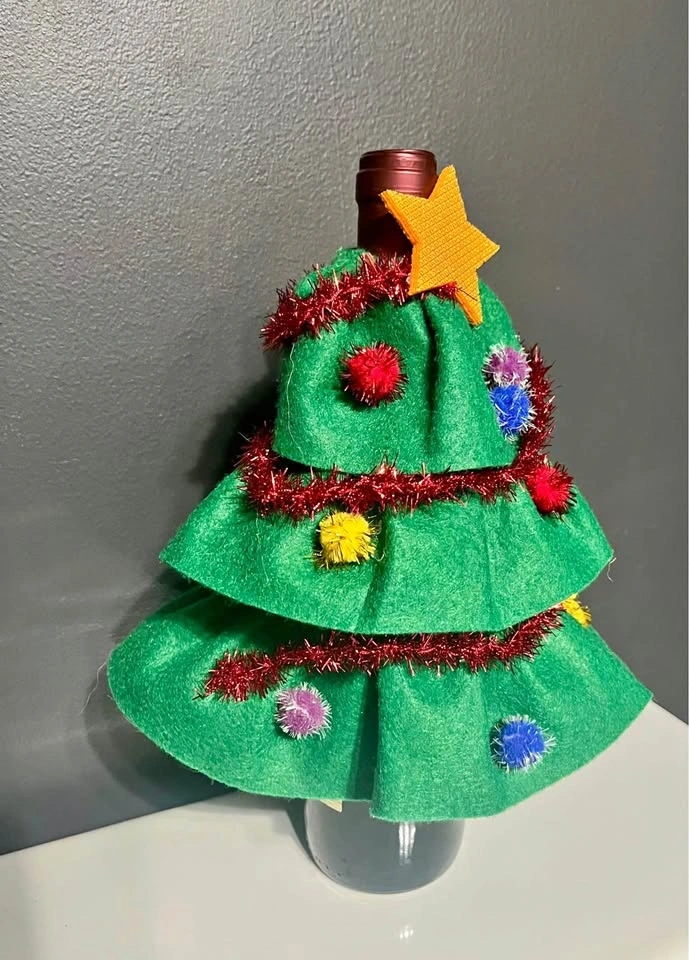 This is a cute Christmas tree-shaped cover for a wine bottle. Perfect for adding a festive touch to your holiday gatherings or as a unique gift!
