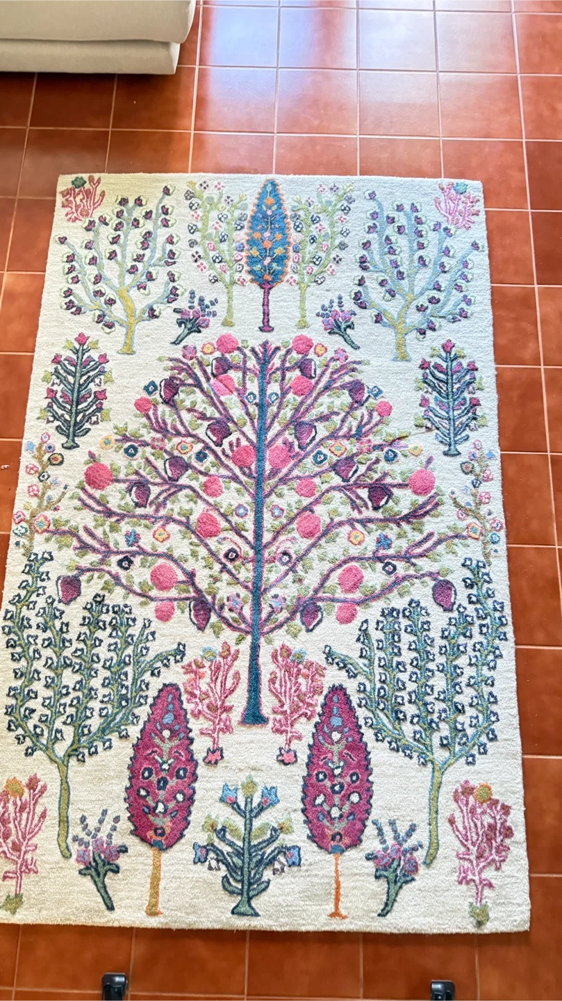 Bold and beautiful hand-tufted wool rug from Anthropologie. This is the Arden Rug, known for its rich tree-of-life design, vibrant color palette, and plush texture.