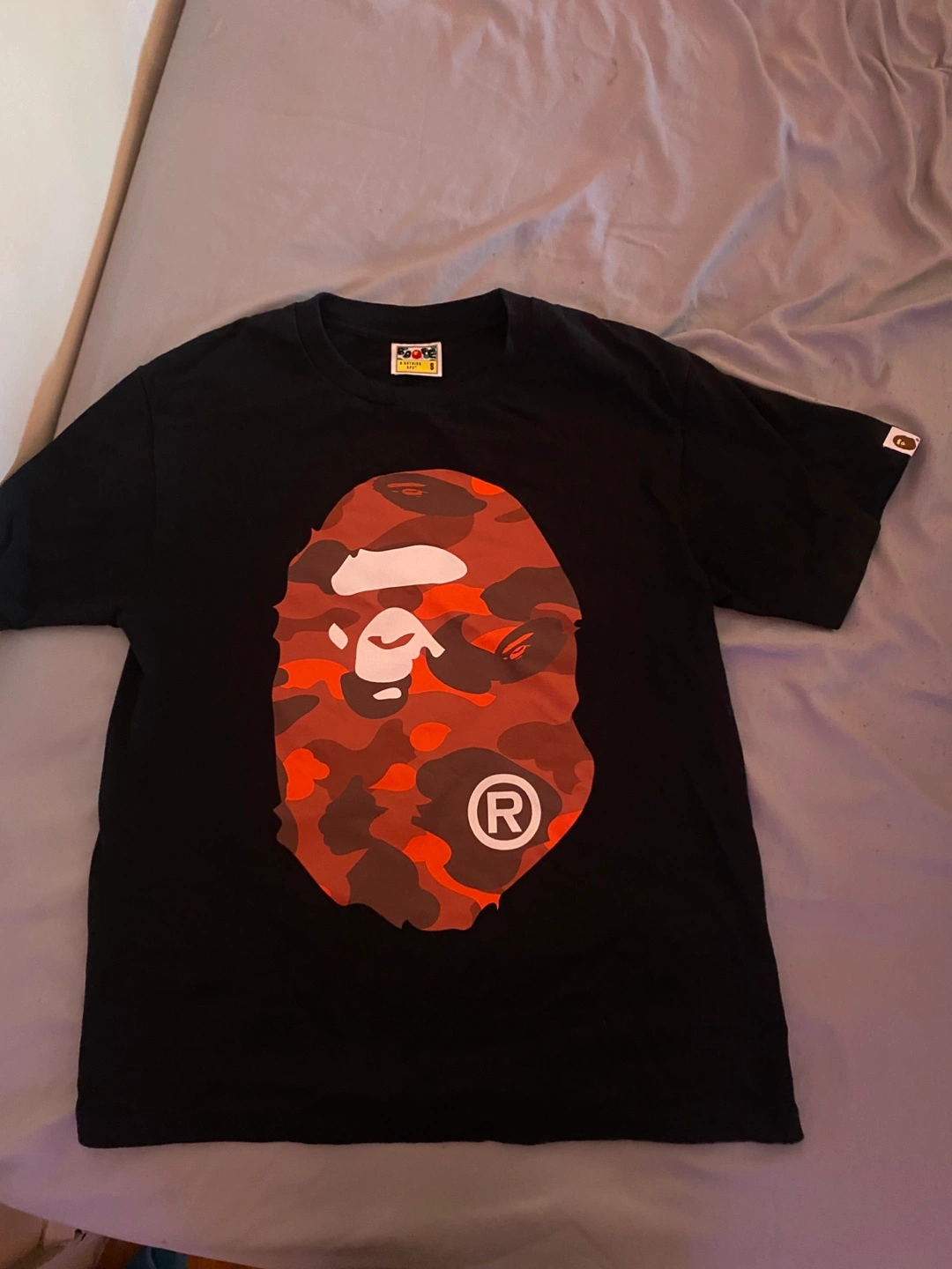 Selling a BAPE tee in black. It features the iconic BAPE head camo design. Size is S.