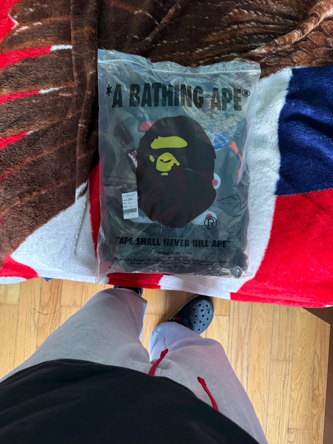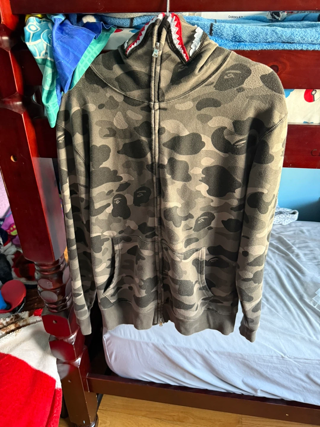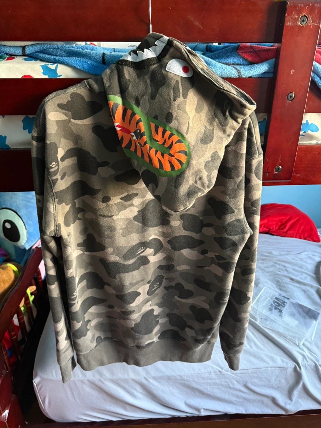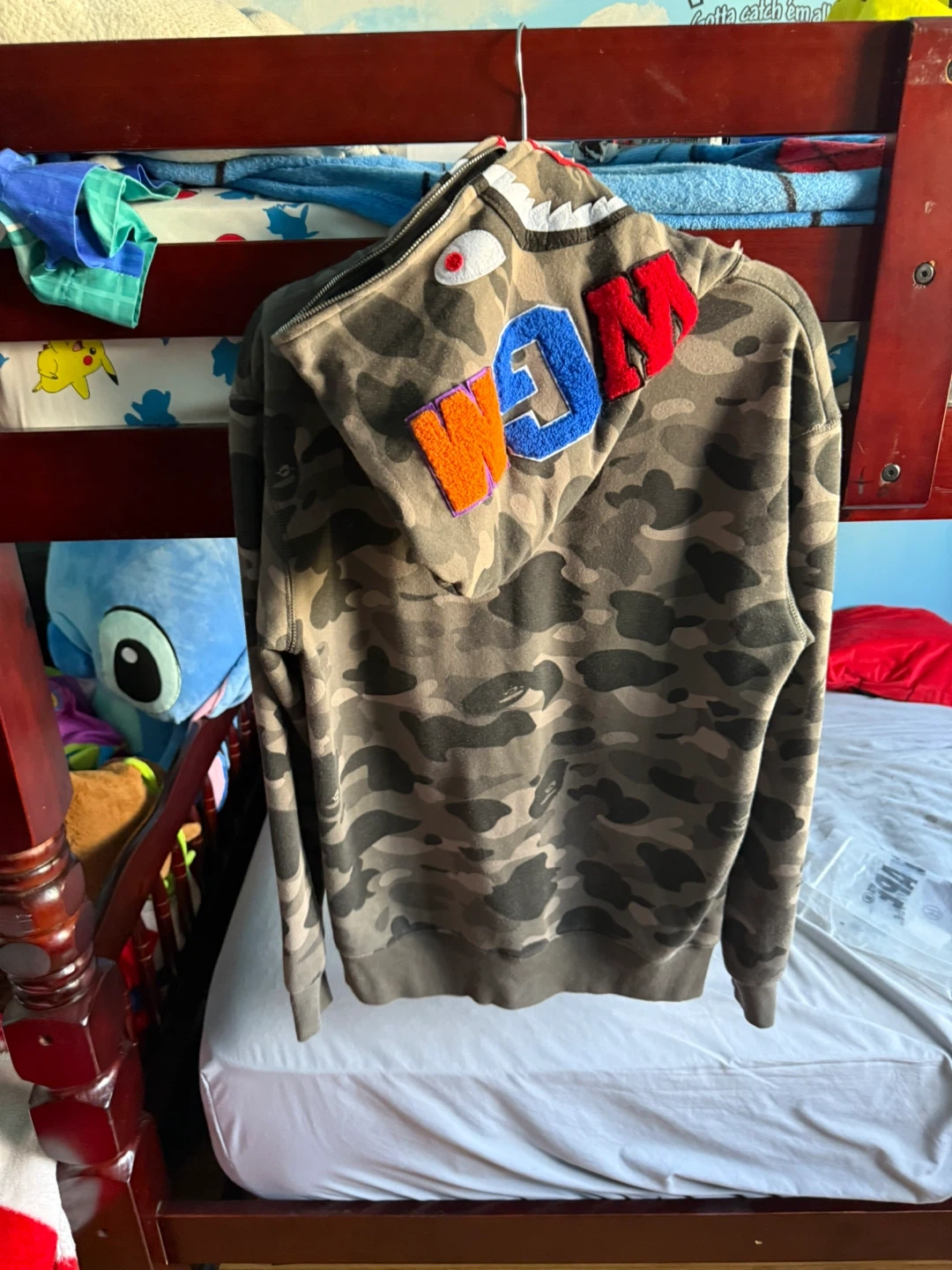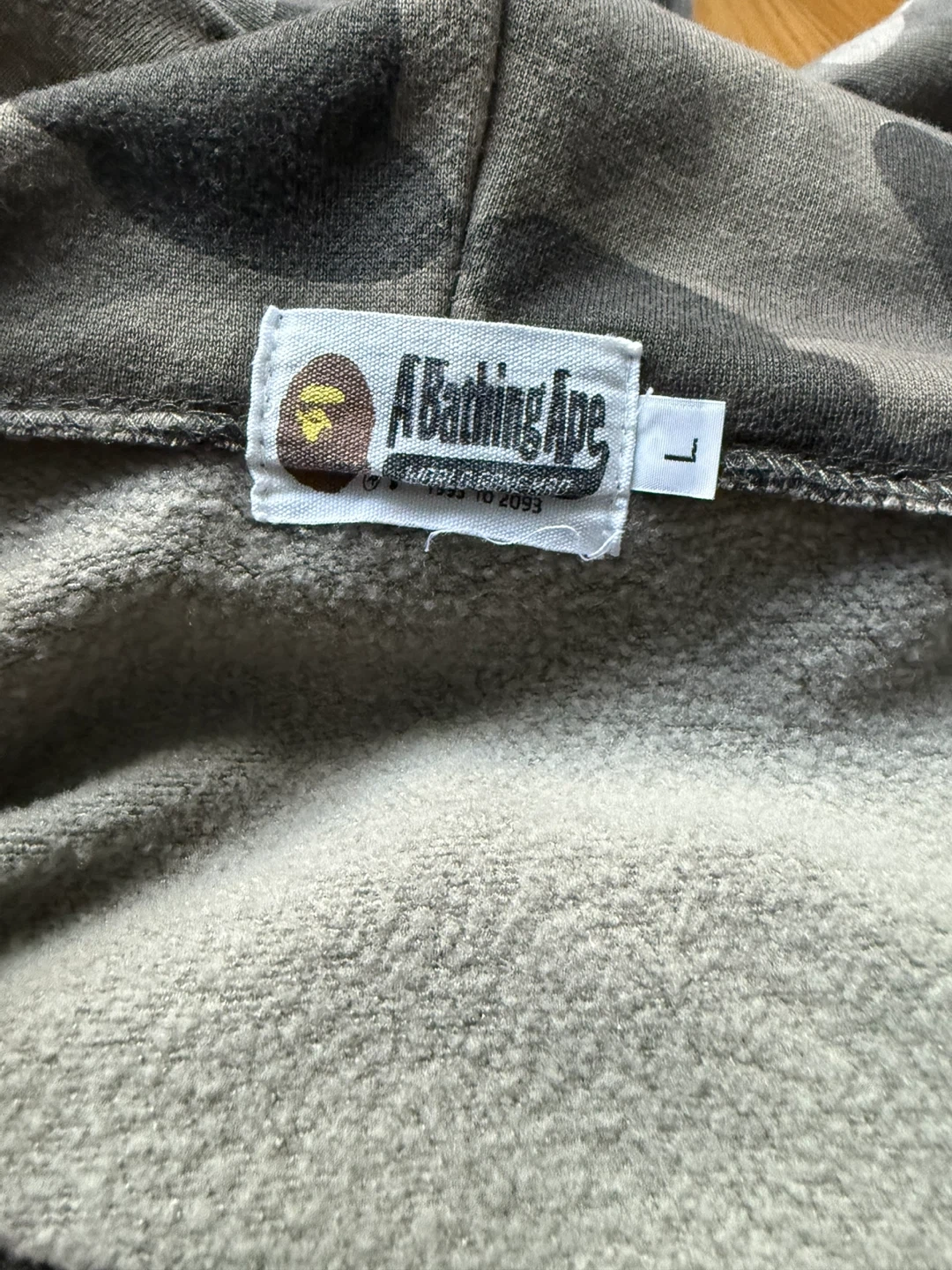 10Selling a BAPE (A Bathing Ape) full zip hoodie in size Large. The hoodie features a camo pattern and the iconic shark design on the hood. It's in great condition and comes in its original packaging!