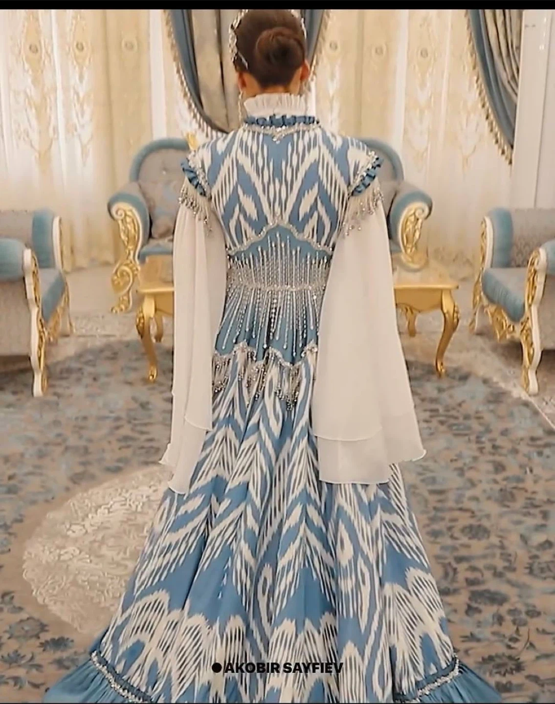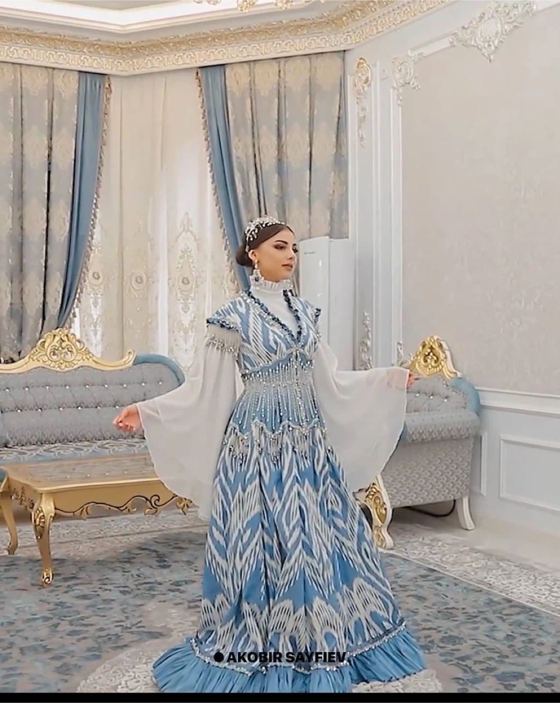 5A beautiful vintage dress comes to pieces white piece separate the top blue piece separate. Comes perfectly as you see a picture with headpiece.