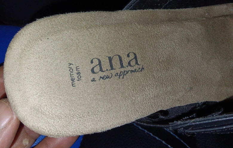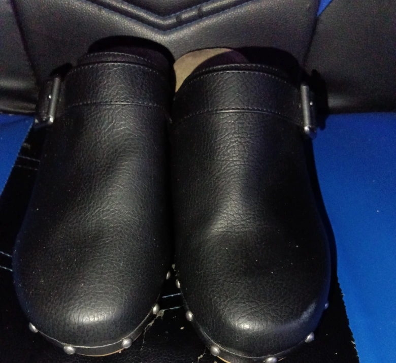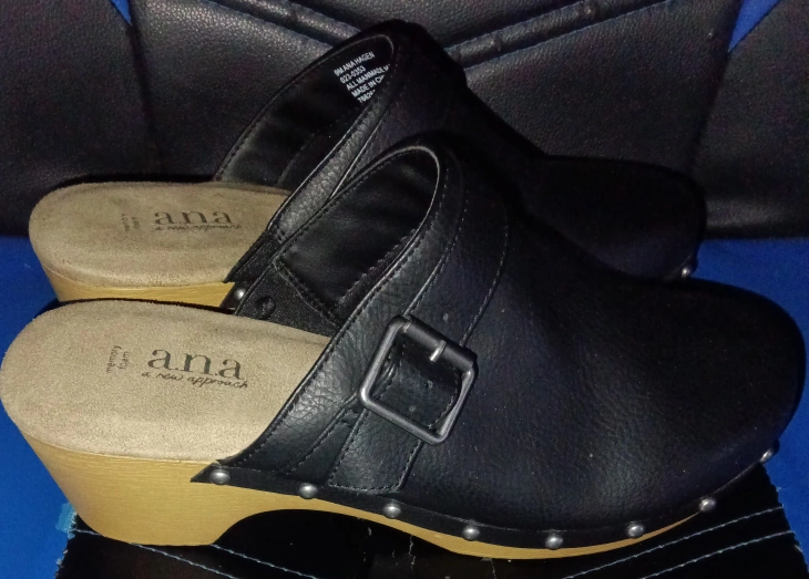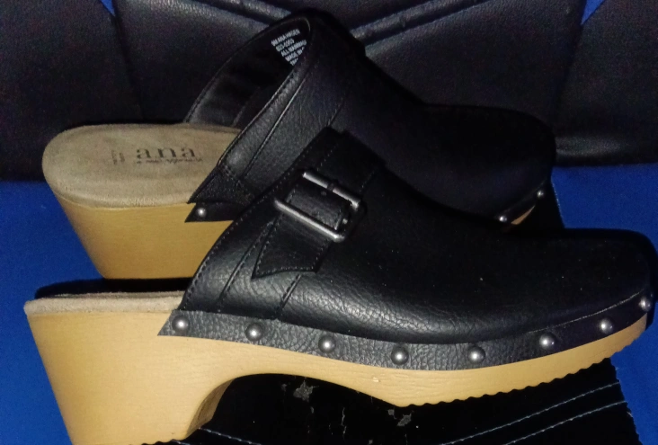 10Selling a pair of a.n.a black clogs. They feature a memory foam insole for extra comfort and a stylish buckle detail. The soles are a light wood color with studded detailing.
