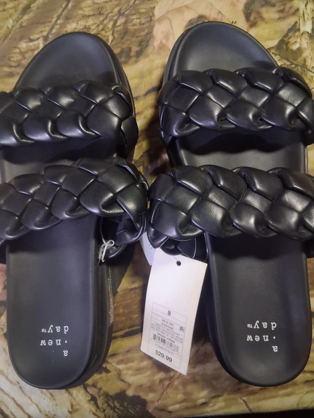 70These A New Day sandals are in black with a braided design. They are a women's size 8. The tag shows they were originally $29.99