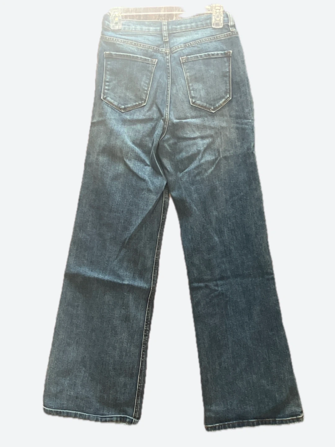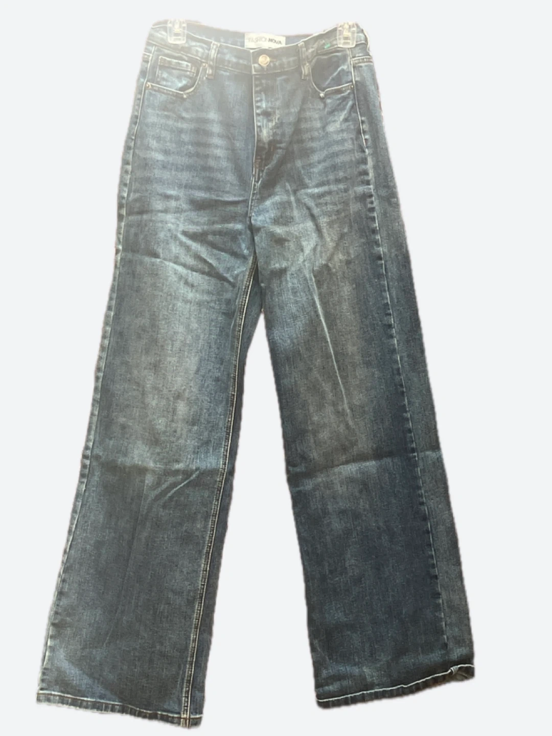 These are Fashion Nova high rise wide leg jeans in a dark wash. They're made of denim. This style is great for a casual everyday look!