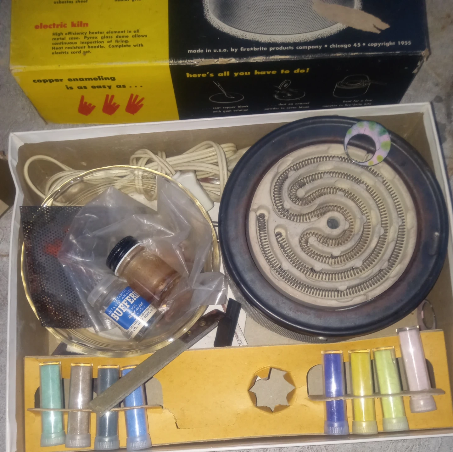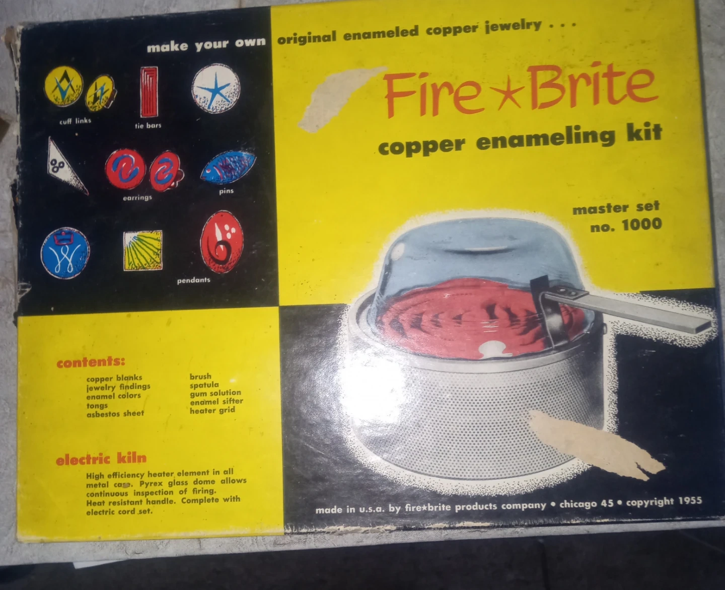 This is the Fire-Brite copper enameling master set no. 1000. It includes copper blanks, jewelry findings, enamel colors, tongs, and an asbestos sheet. The electric kiln features a high-efficiency heater element and a Pyrex glass dome.