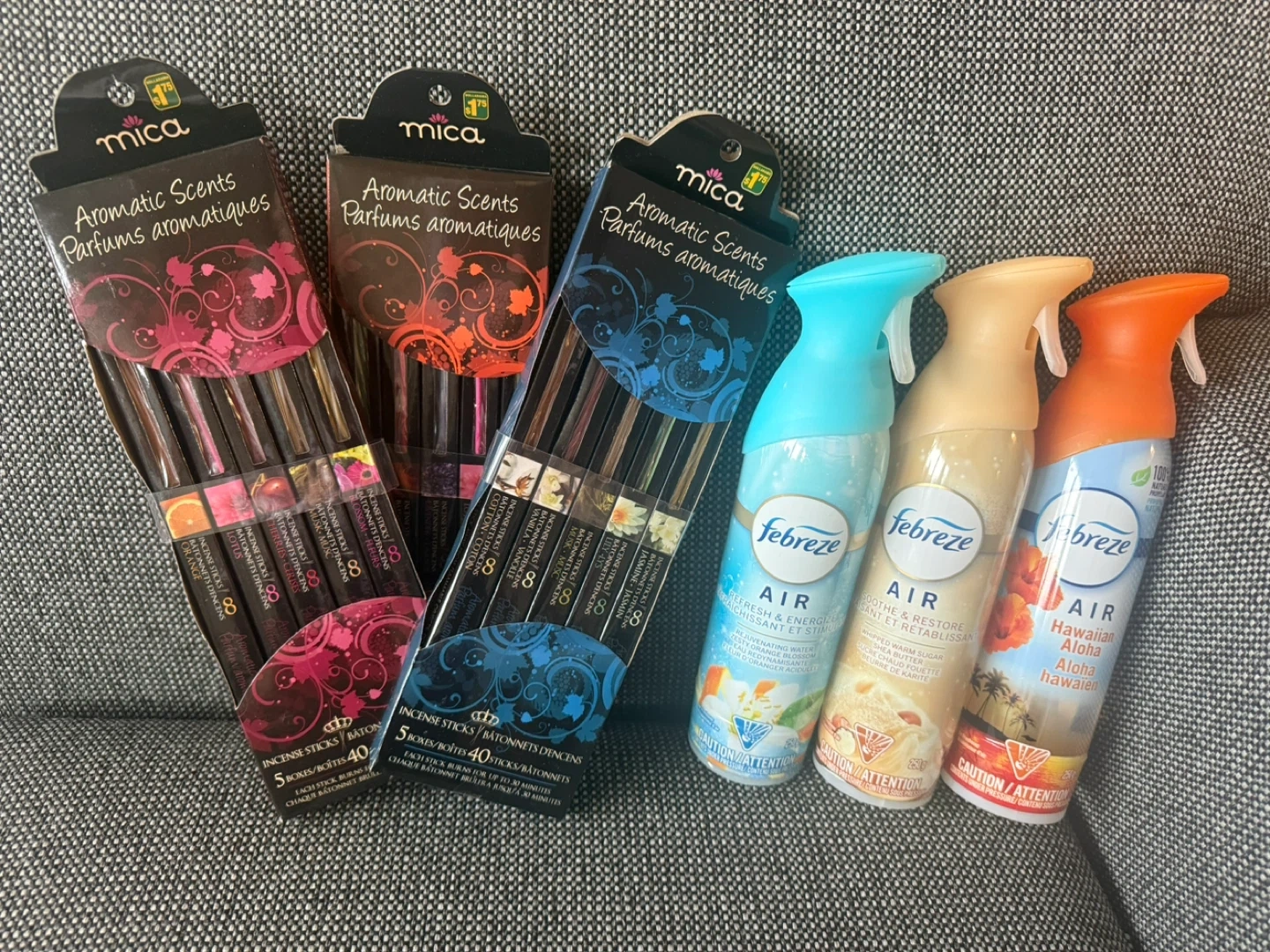 Selling a mix of Mica aromatic incense sticks and Febreze air fresheners. The Mica incense sticks come in a pack of 5 boxes with 40 sticks in total. Scents include jasmine, lily, musk, vanilla, cotton, lotus, cherries, and orange.