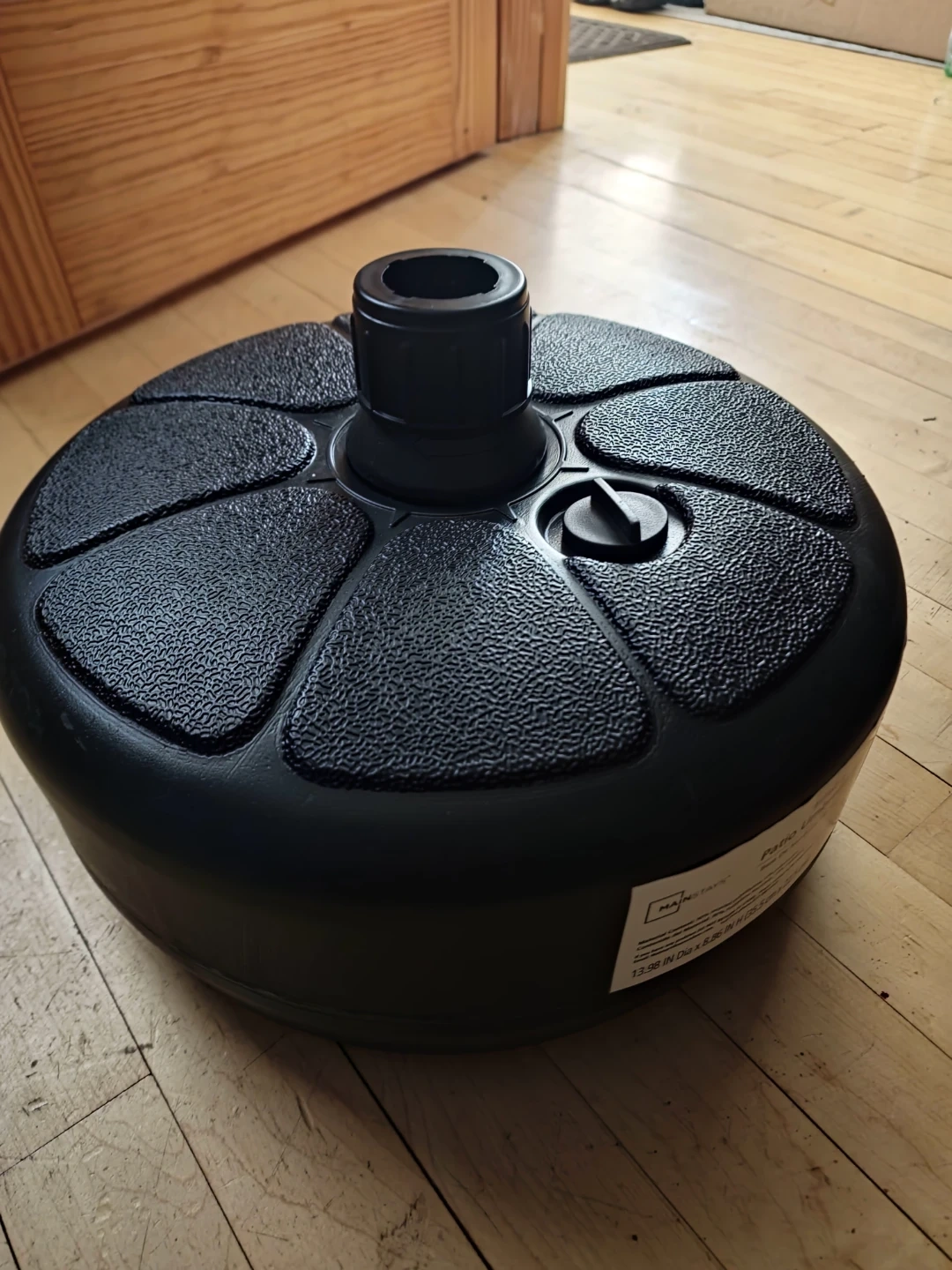 This is new patio umbrella base. It's made of durable plastic. It measures 13.38 IN Dia x 6.85 IN H. Pickup near Harlem and Devon Chicago 60631