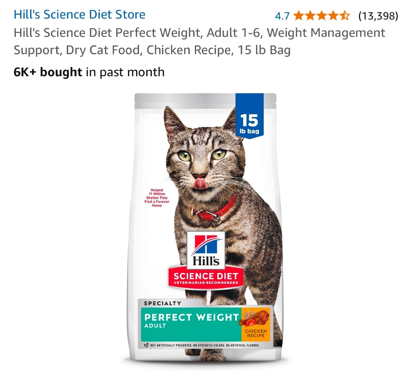 Adult 1-6, weight management support, dry cat food, chicken recipe. My kitty didn’t like it so I’ll have to give away. Only one portion taken out of bag (1/4 cup).