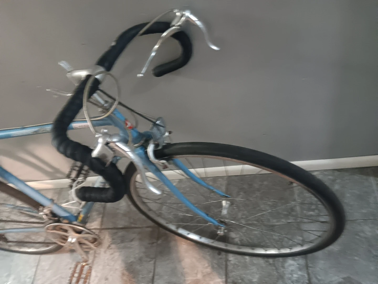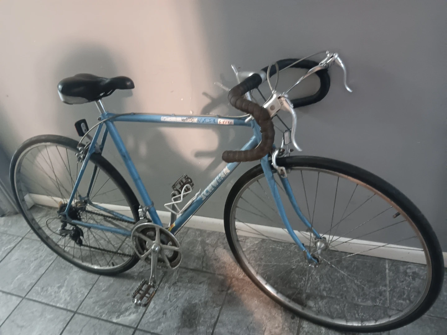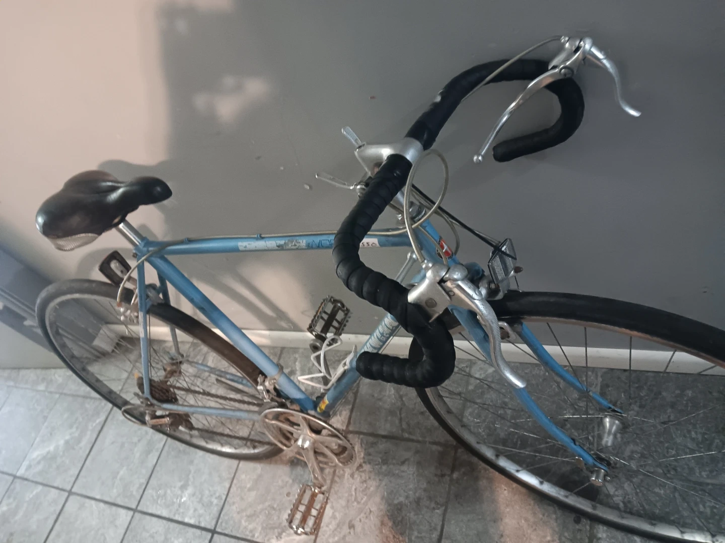 Selling a vintage Motobecane Grand Touring road bike. It's a classic ride with a light blue frame and drop handlebars. Perfect for leisurely rides around town or longer tours. It has some wear and tear, but it's still a great bike!