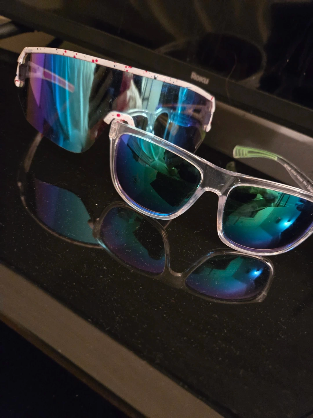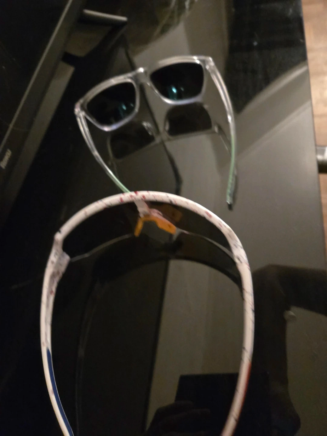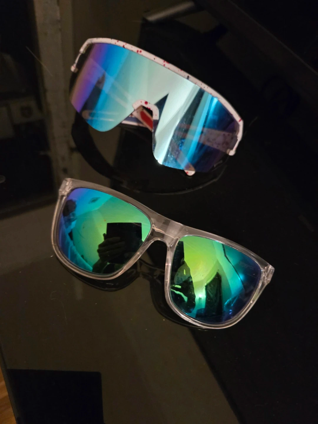 Selling two pairs of sunglasses. One pair has clear frames and the other has white frames with red and blue accents. Both are in good condition!