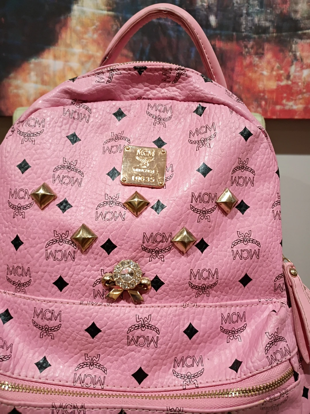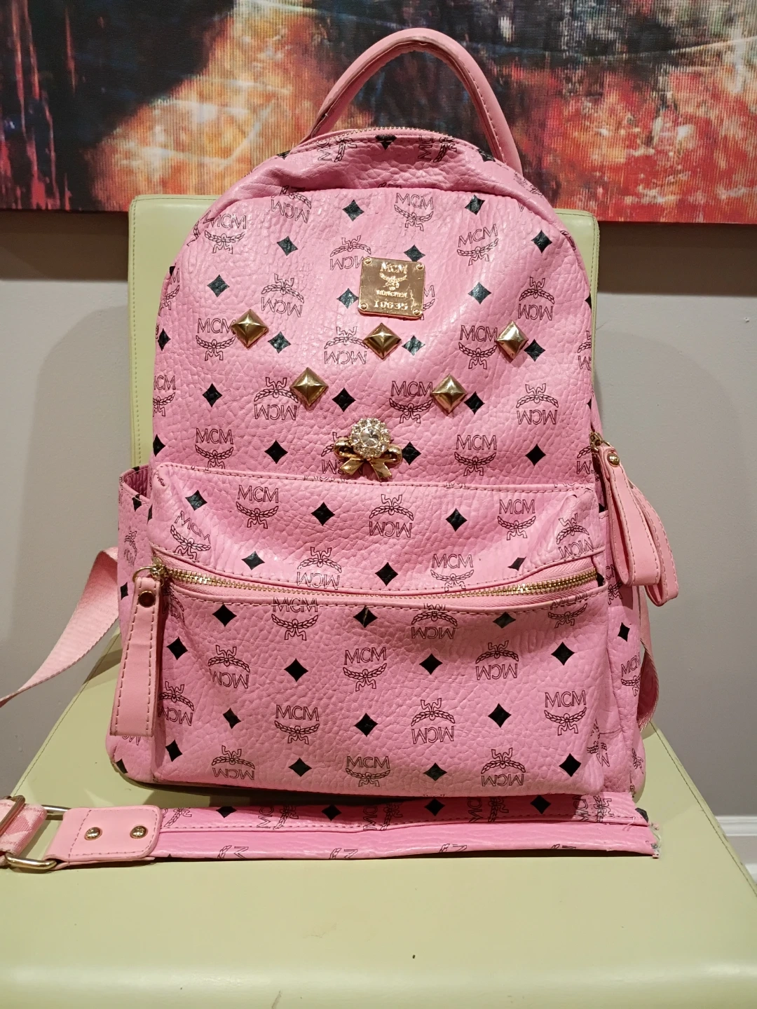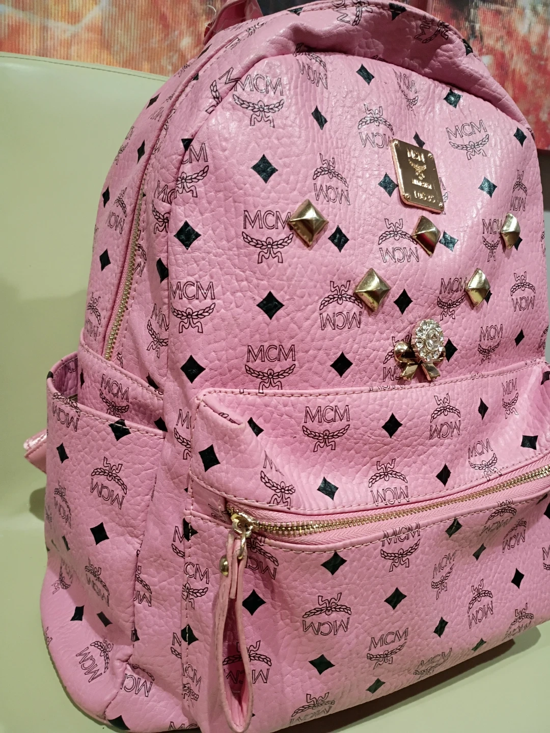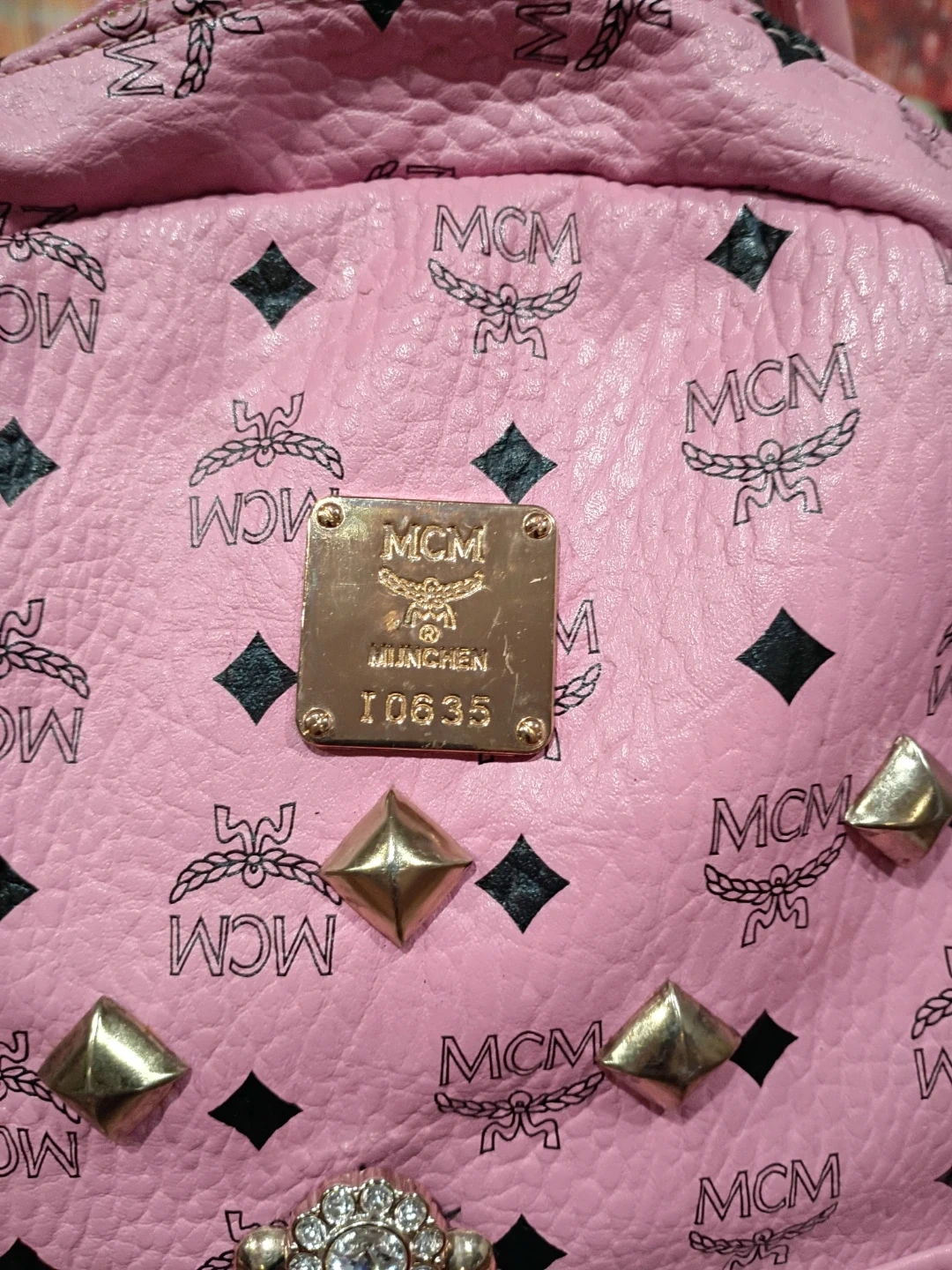 Pink MCM backpack with signature Visetos print and gold-tone studs. Features a top handle and adjustable shoulder straps. Includes exterior zippered pocket.