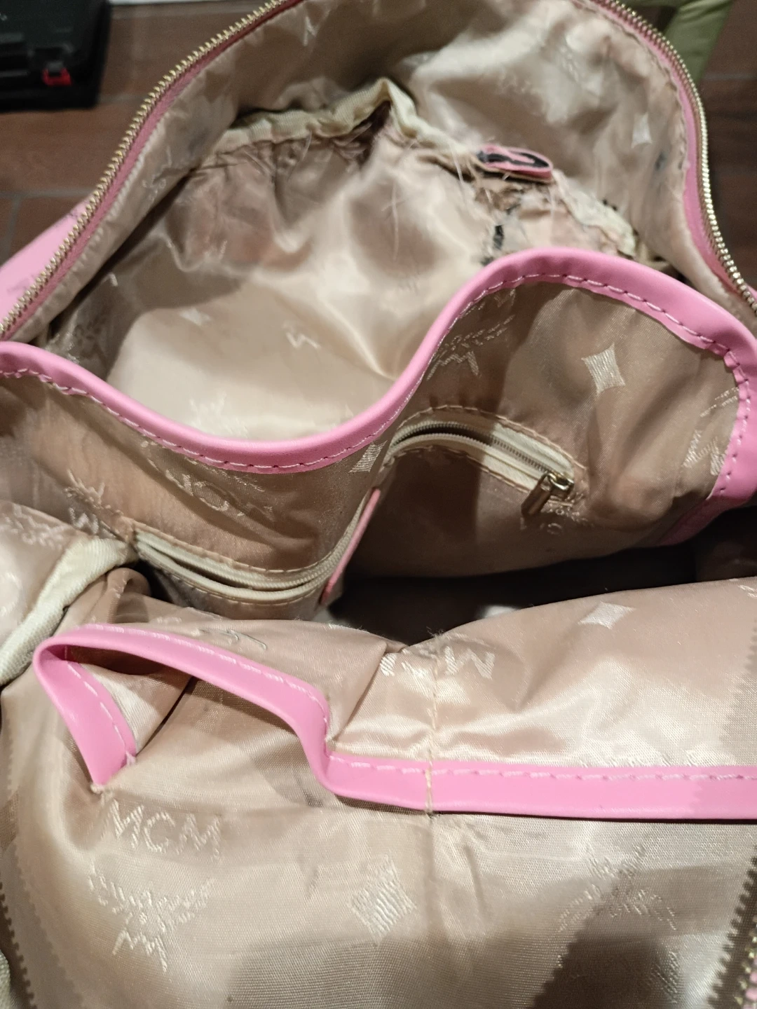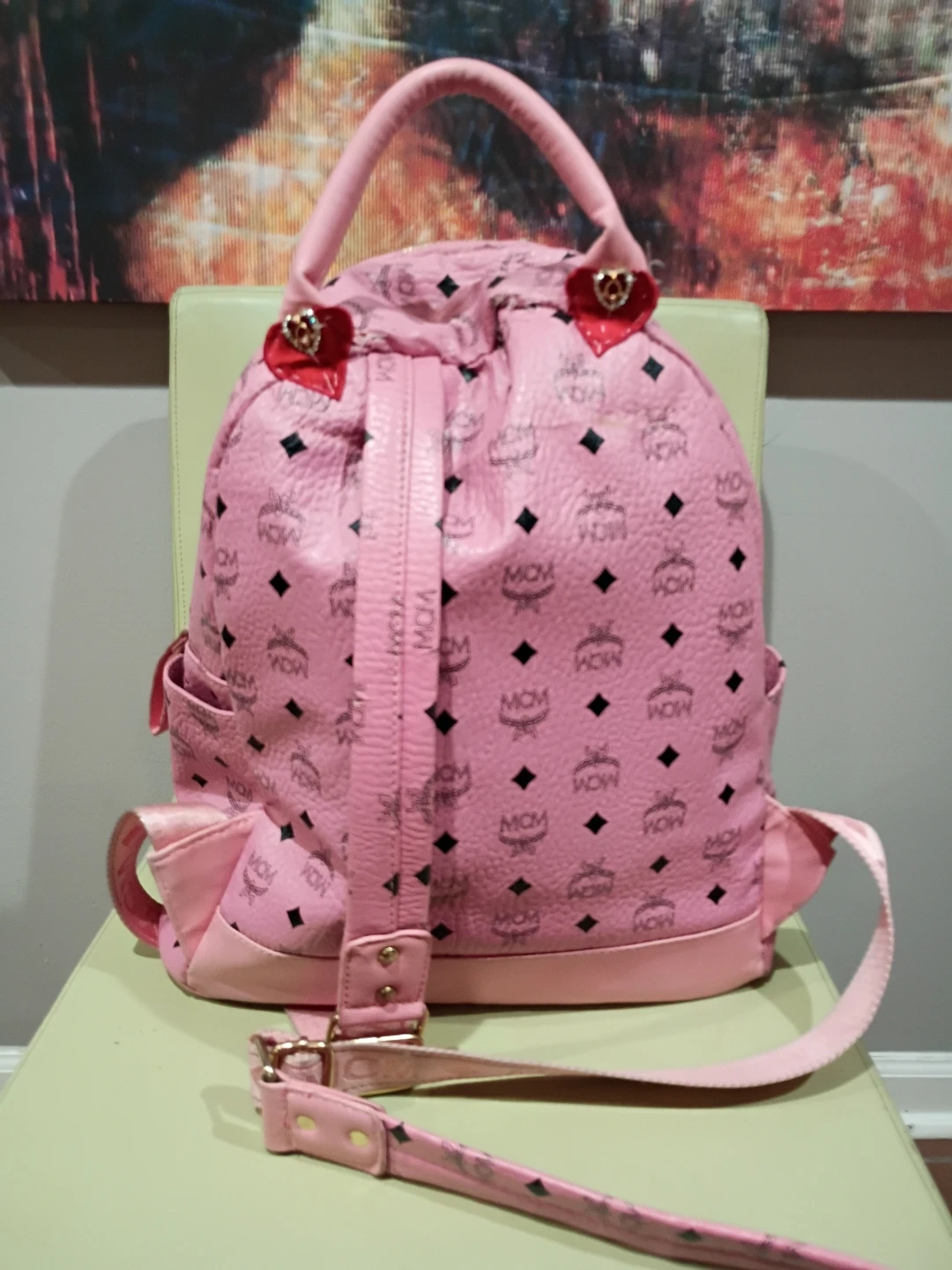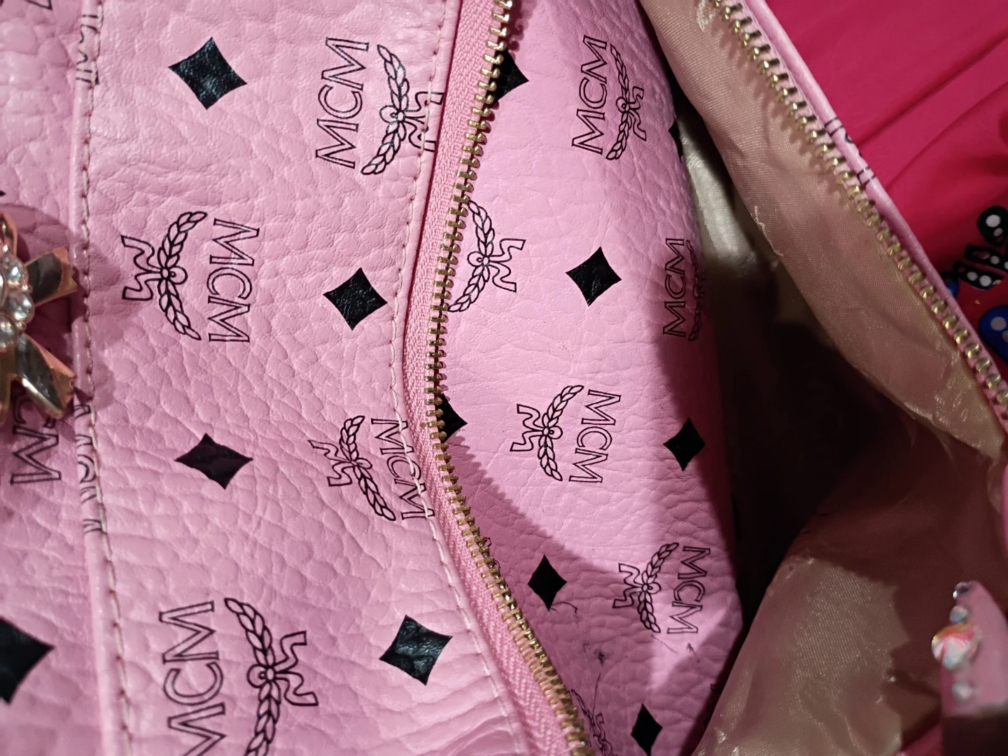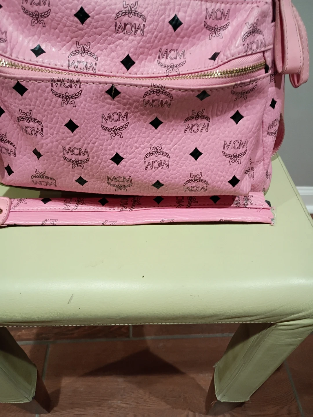 Pink MCM backpack with signature Visetos print and gold-tone studs. Features a top handle and adjustable shoulder straps. Includes exterior zippered pocket.